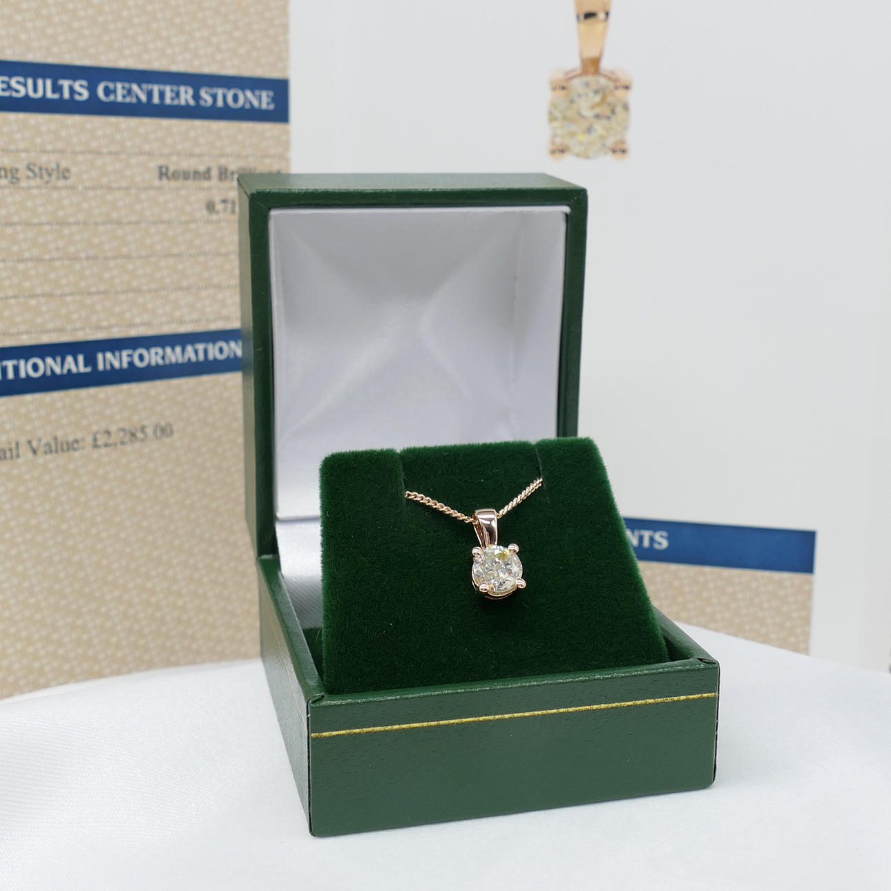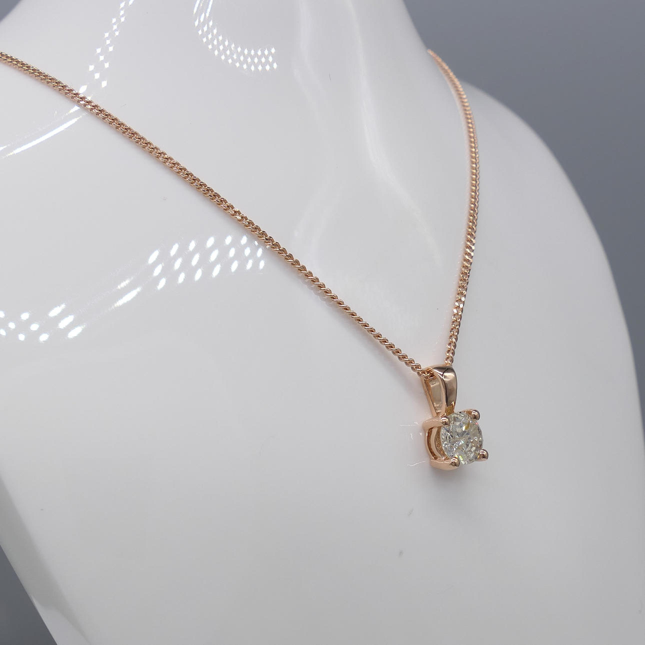 Hänge 18k roséguld med en rund briljantslipad diamant som väger 0,71 karat. Levereras med kedja, låda och certifikat.