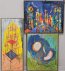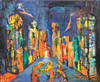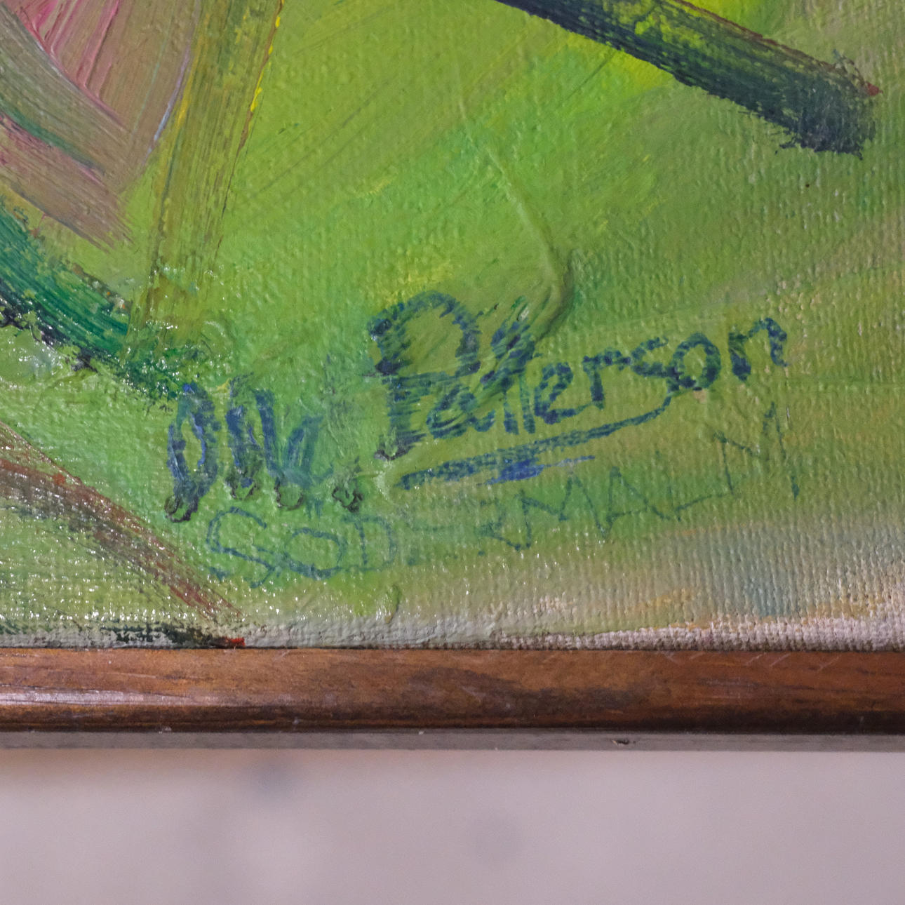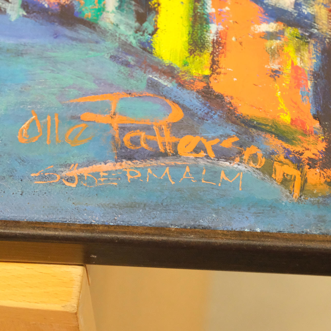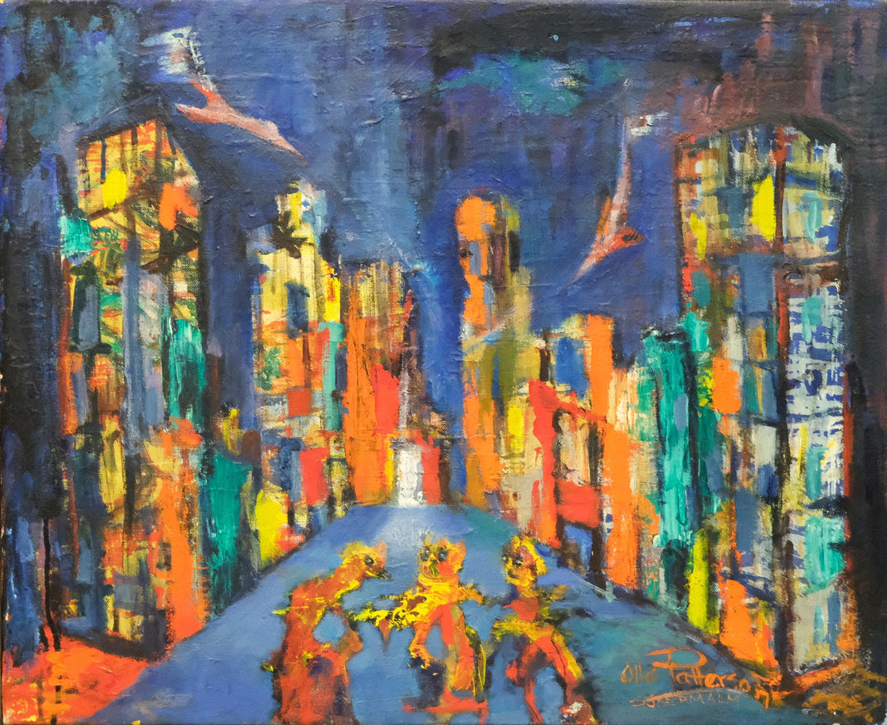 Olja på duk, "Natten när medborgarna vaknade". Signerad Olle Patterson. Namngiven på baksidan. Mått: ca 63 x 52 cm.