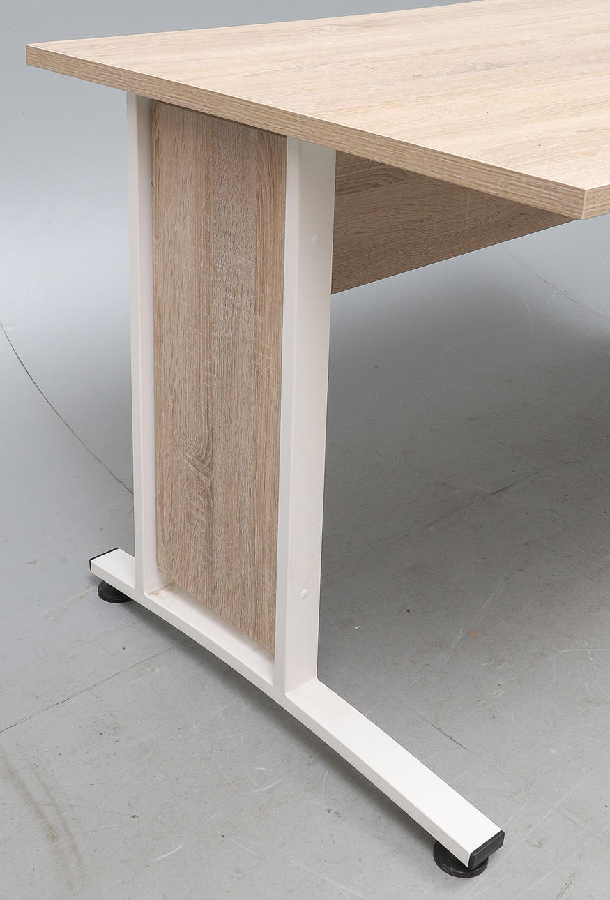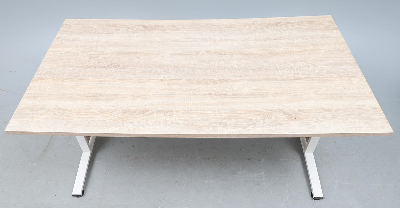 den rektangulära toppen stöds av vita metallben, 150.5cm bred x 80.5cm djup x 75cm hög.