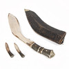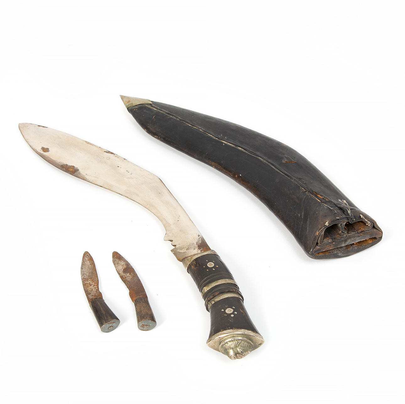 Trä och metall. 3 knivar, 38 cm och 9,5 cm.