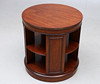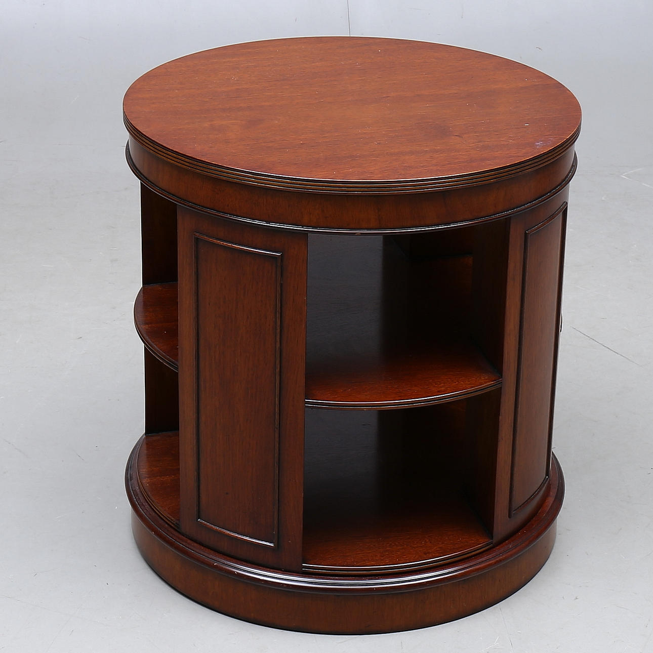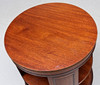 Mahognyfaner, rund form med ett hyllplan, snurrbar. Diam 59,5, höjd 62 cm.