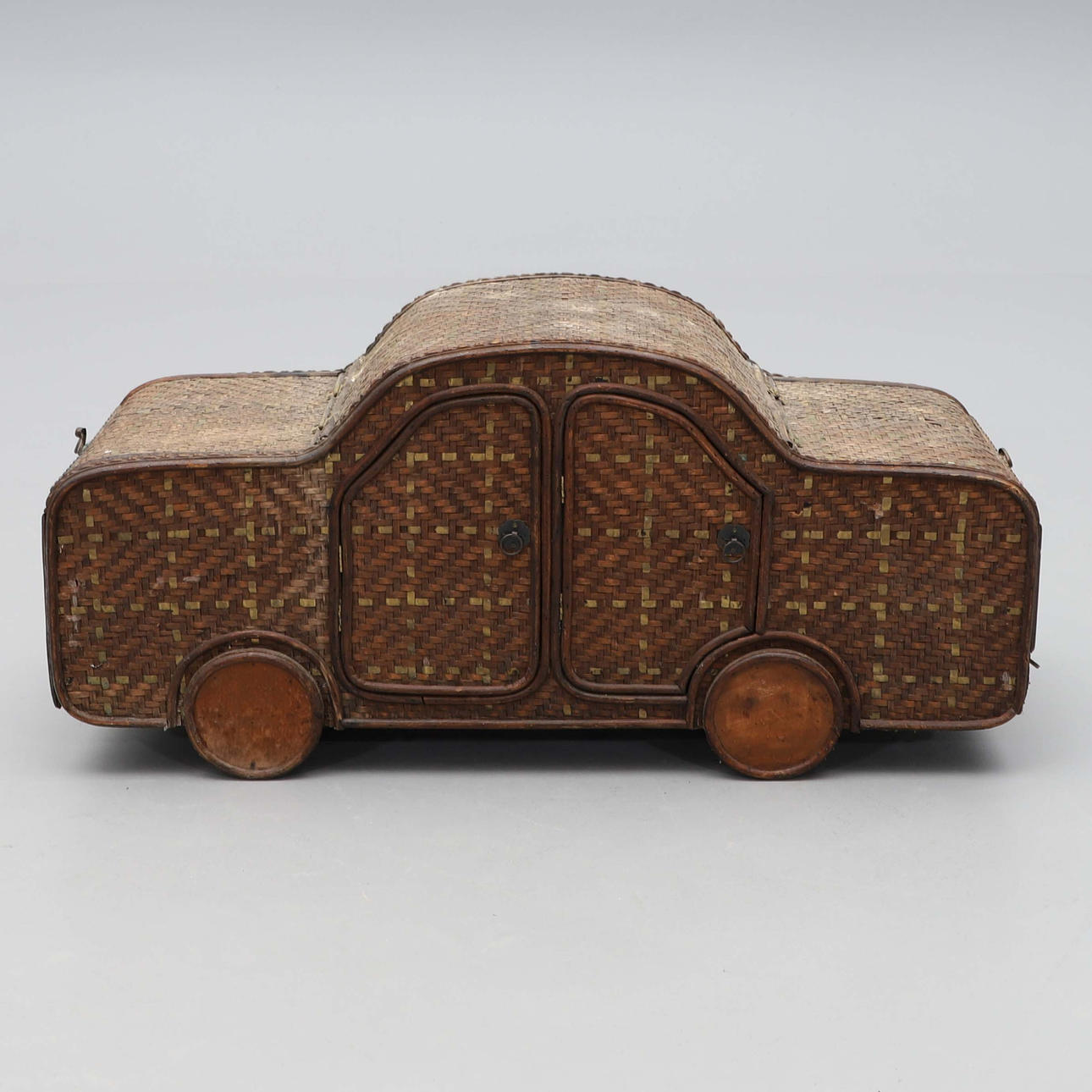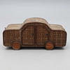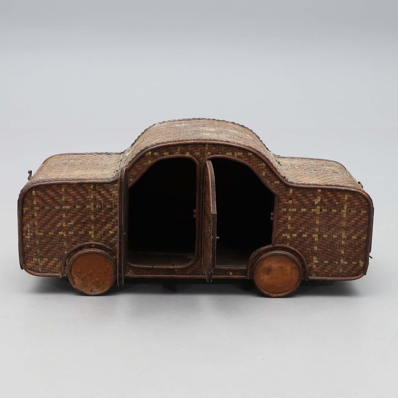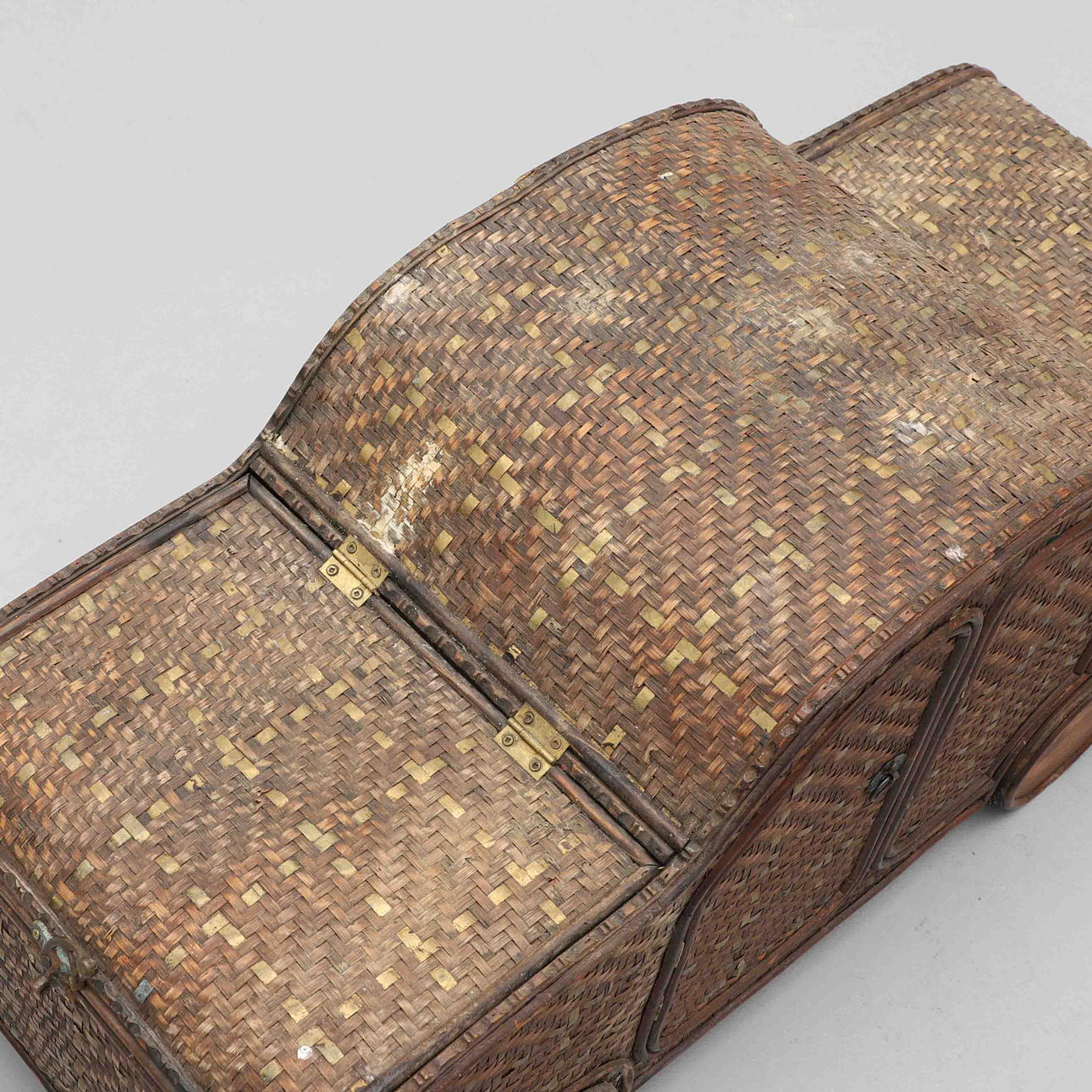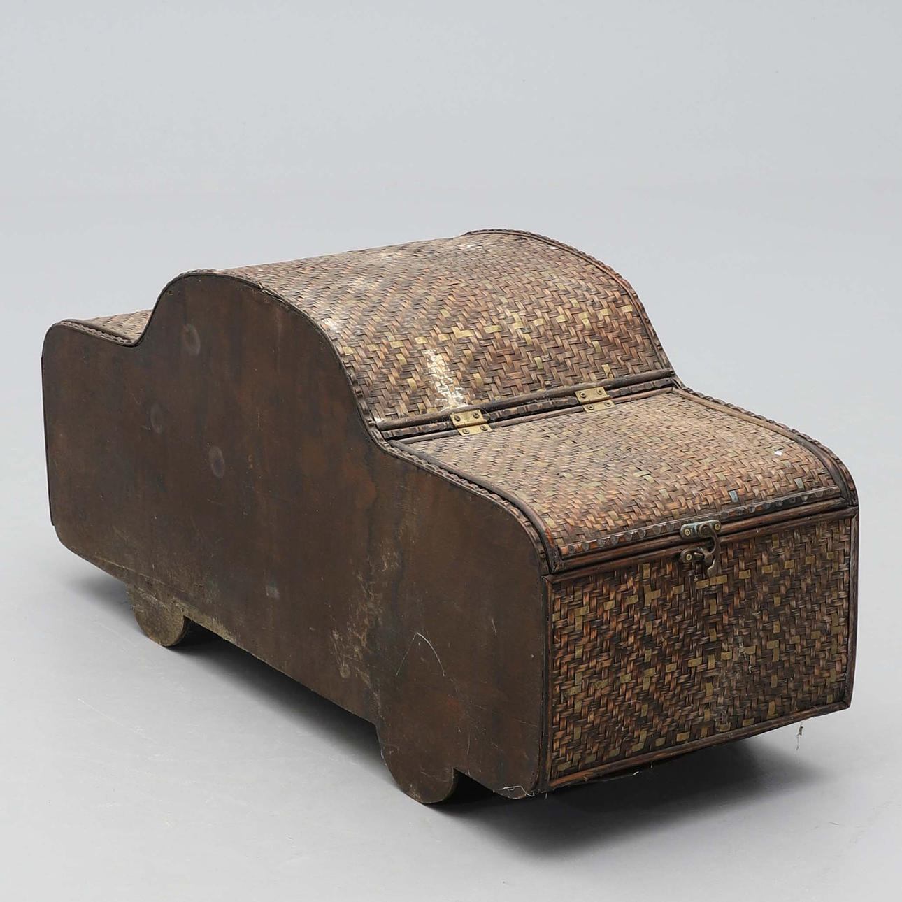 2547856. KORGFÖRVARING, i from av bil, flätad, mässing, 1900-talets andra hälft.