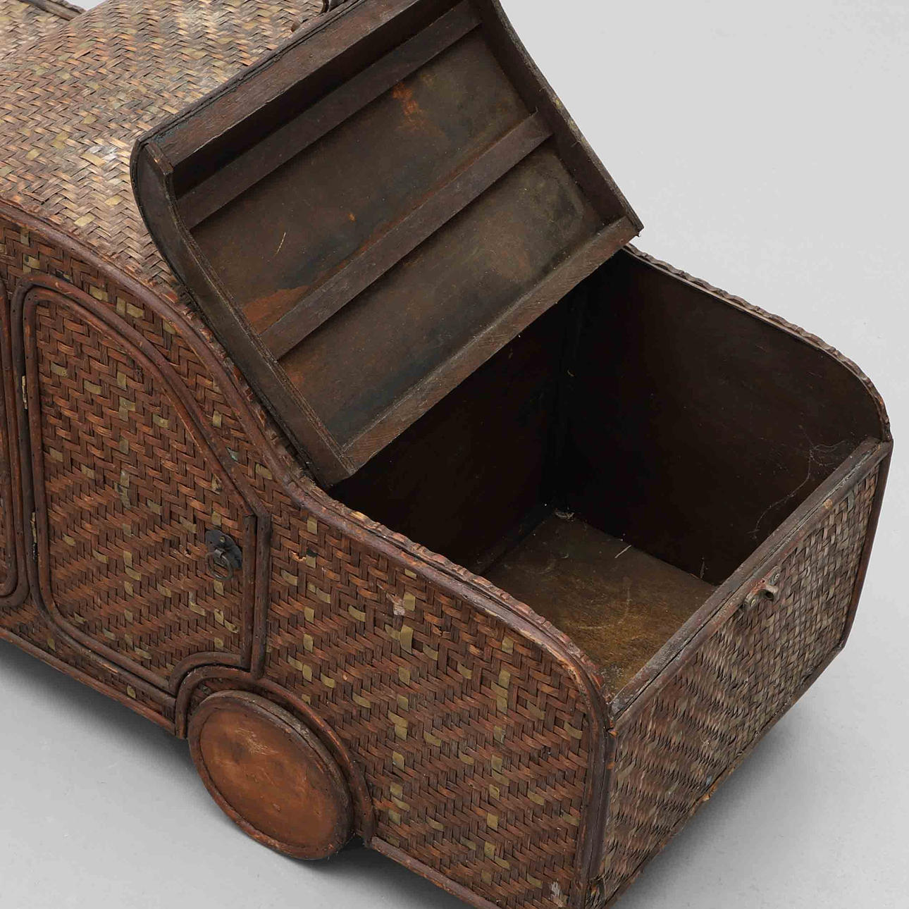 KORGFÖRVARING, i from av bil, flätad, mässing, 1900-talets andra hälft.