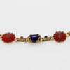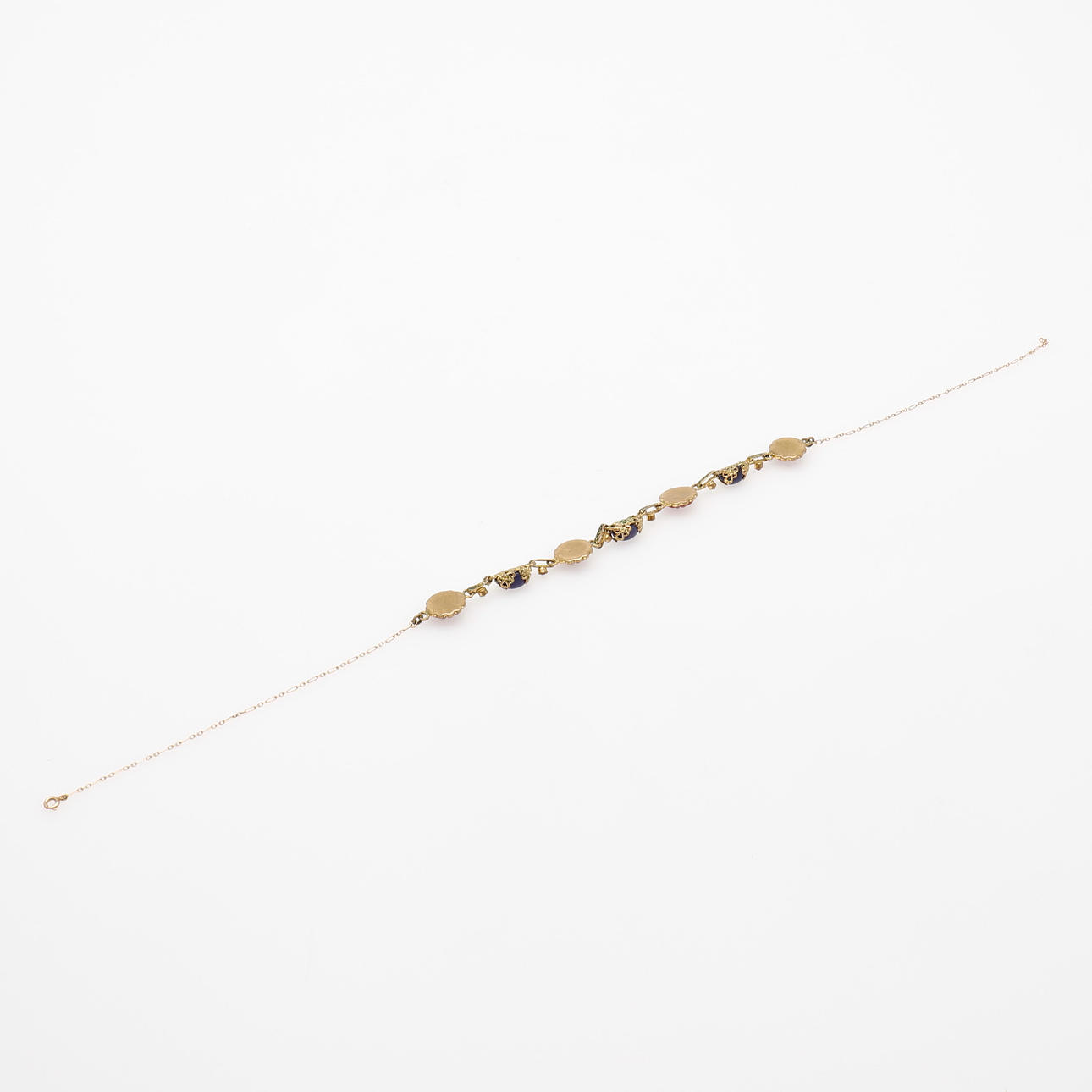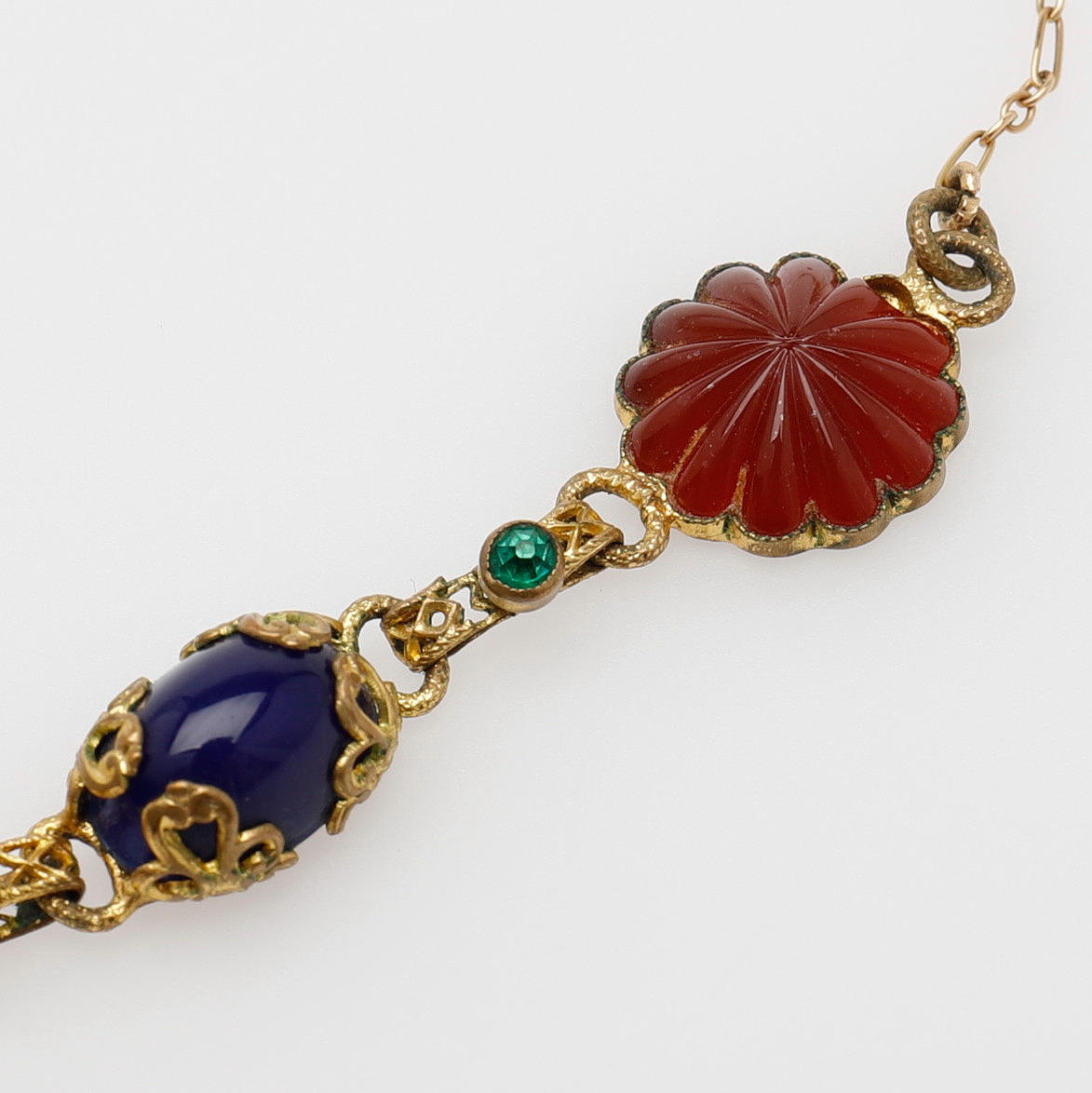 Front med paste monterat i mässing, kedja av 18k guld, längd 45 cm.