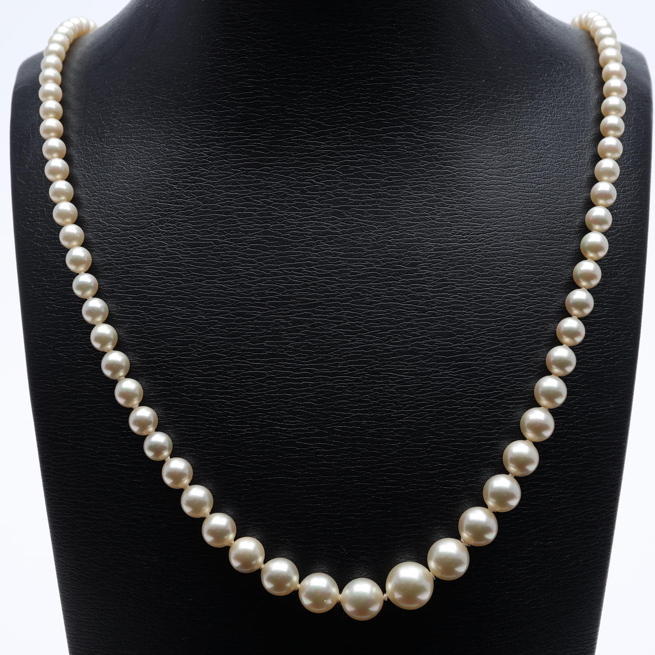 Doserat pärlcollier med silverlås och säkerhetskedja. Original etui samt certifikat medföljer. Längd: ca 58.5cm.