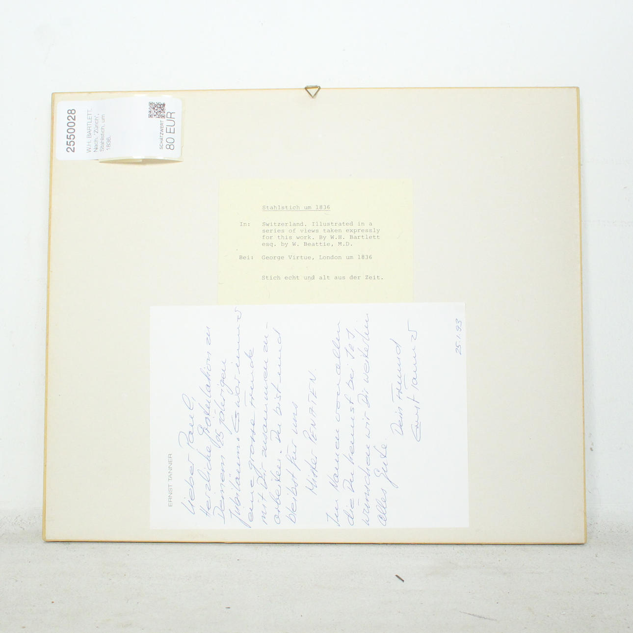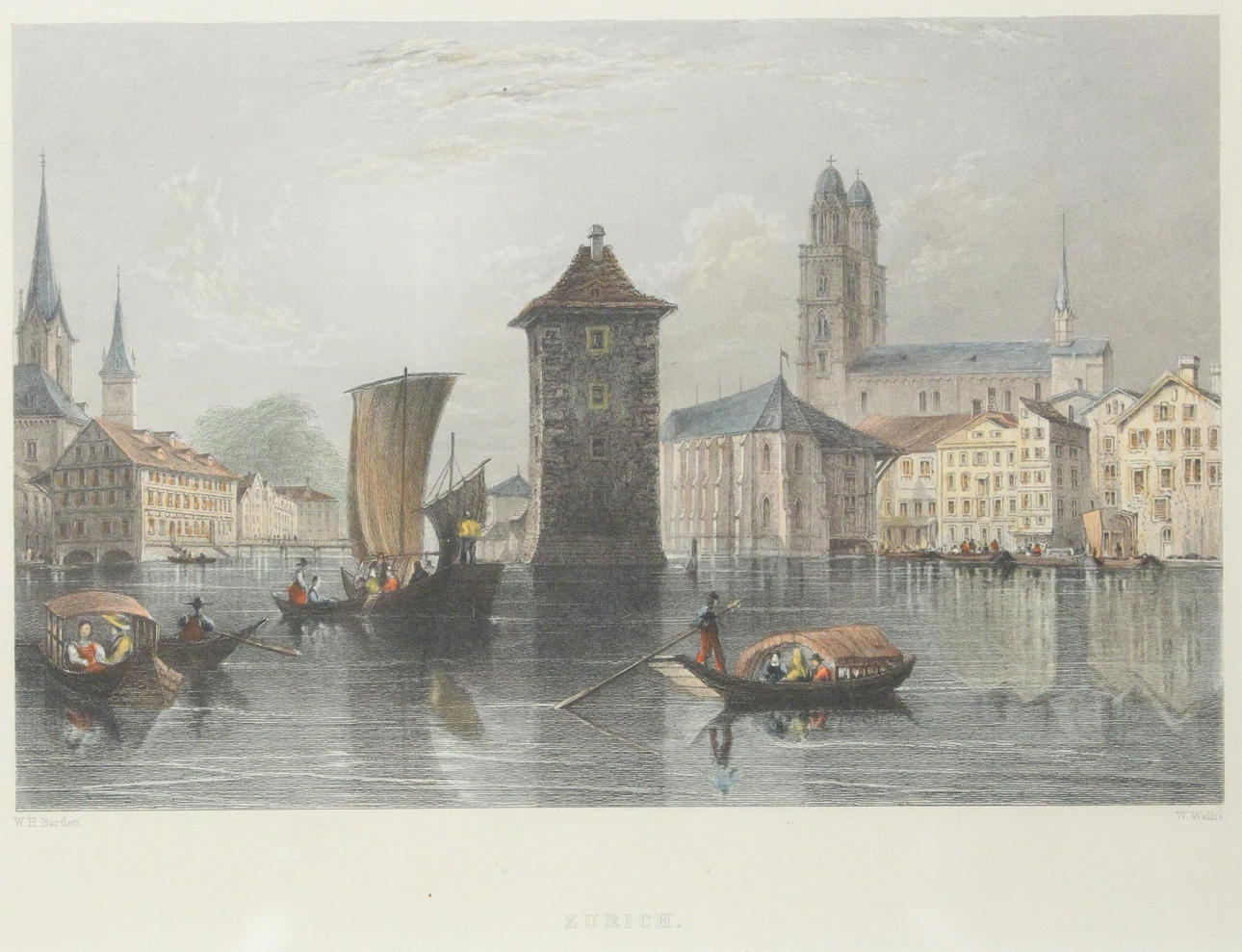 Färgad stålgravyr av W.H. Bartlett, ”Zürich”, omkring 1836, inramad, Bildstorlek: 12 x 18 cm Ramstorlek: 30,5 x 36 cm.