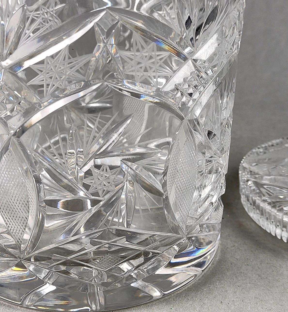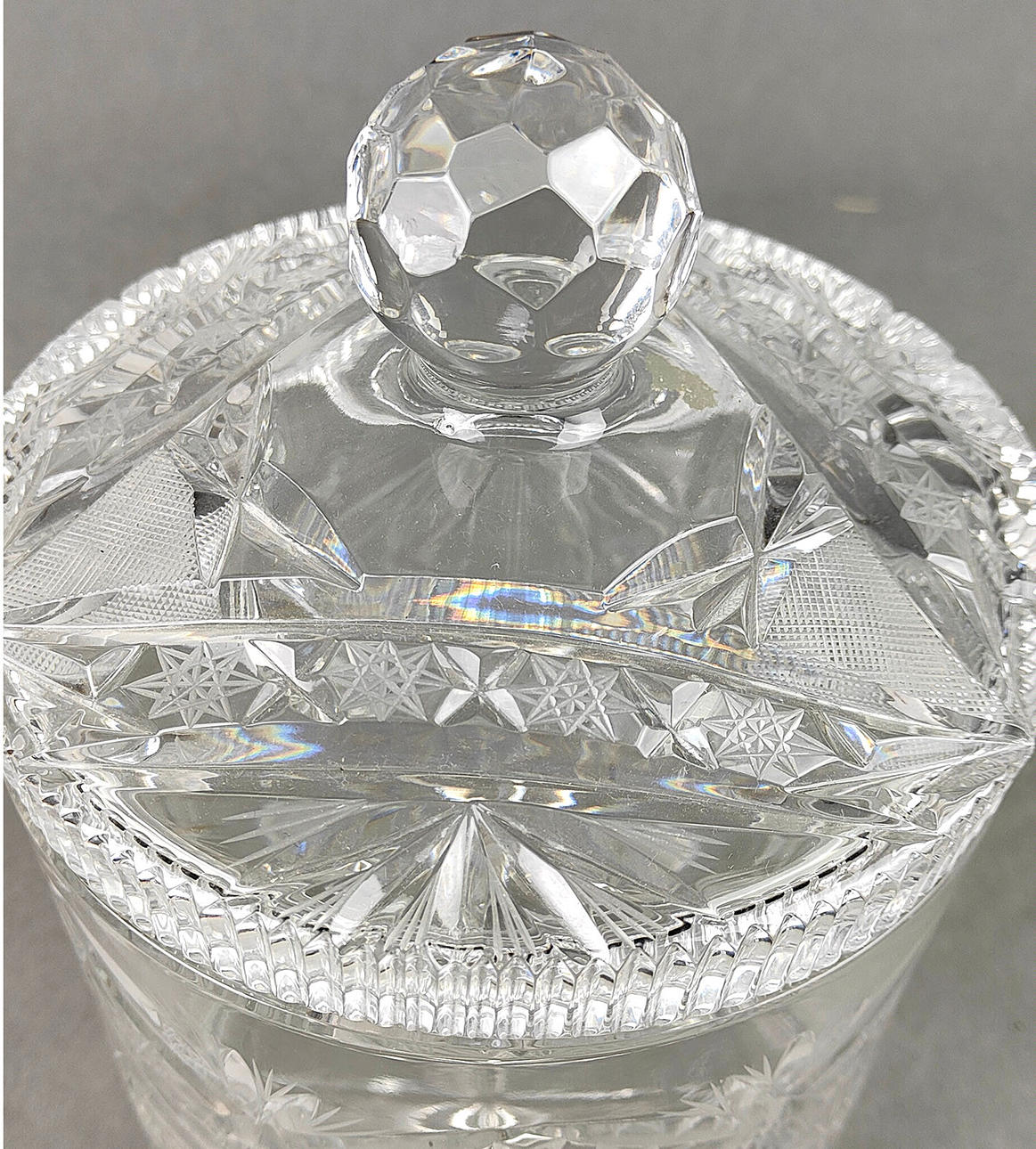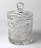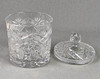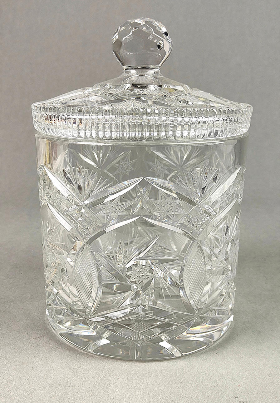 Färglöst kristallglas, handblåst och slipad för hand, stor cylinderkropp med slanghotstjärna och fläktdekoration mark i 6-faldig symmetri, höjd med lock ca.. 25cm.