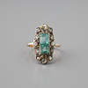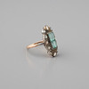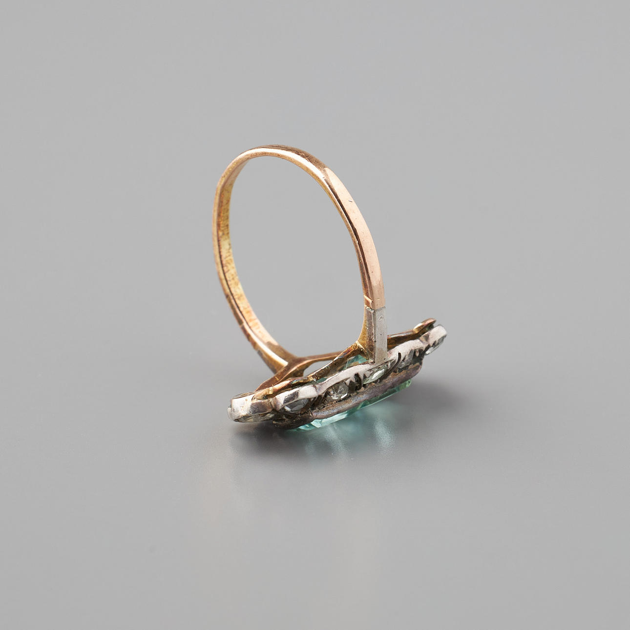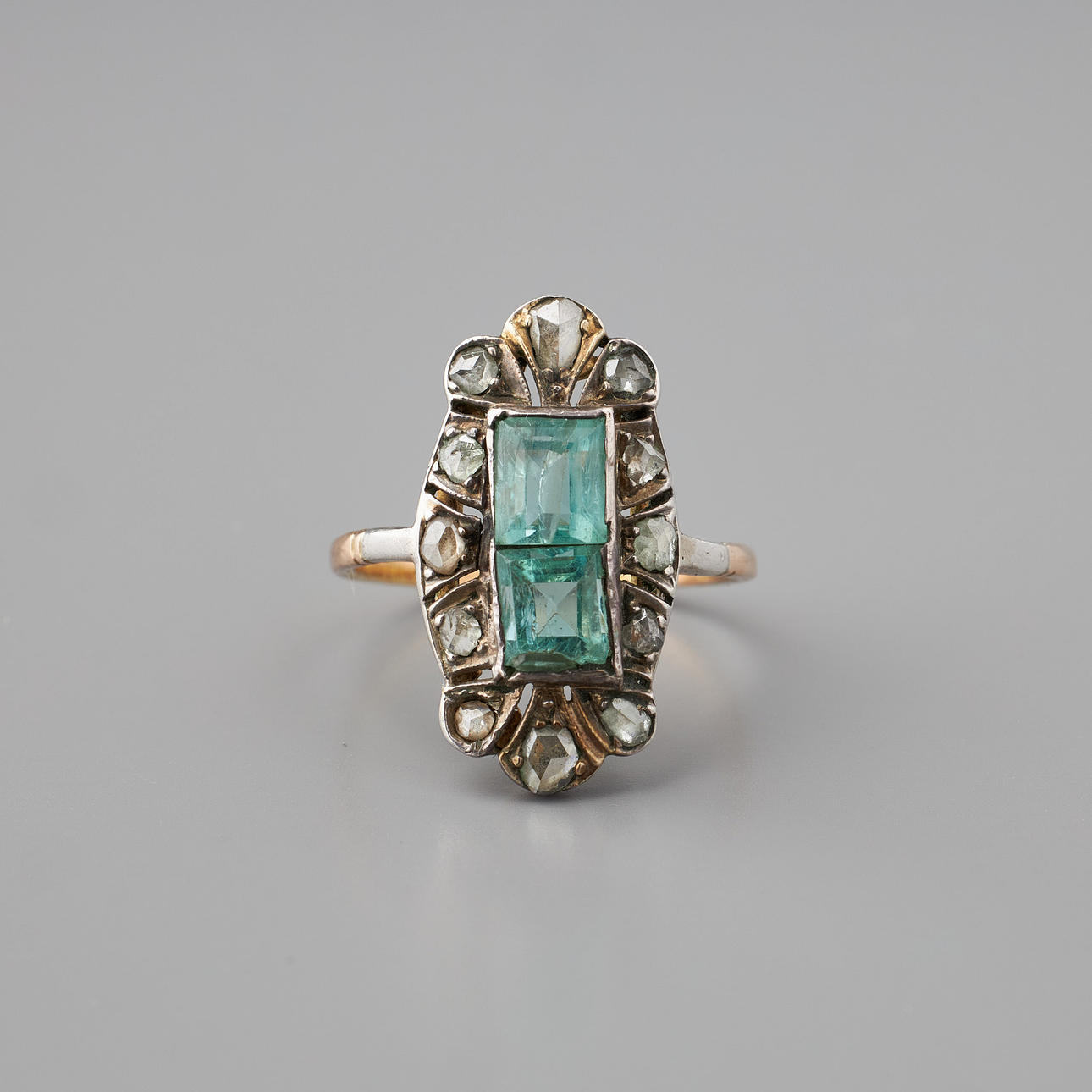 Rektangulära beryller ca 5 x 5,5 mm, 12 rosenslipade diamanter infattade i silver, ringens stporlek 17,5; vikt ca 3,1 g.