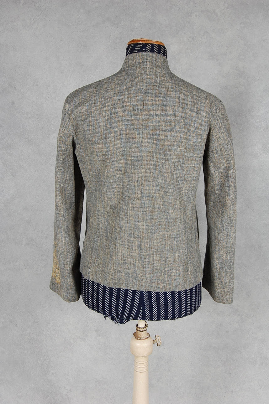 Olivgrön, dold knäppning, guldbroderi ärmsluten.