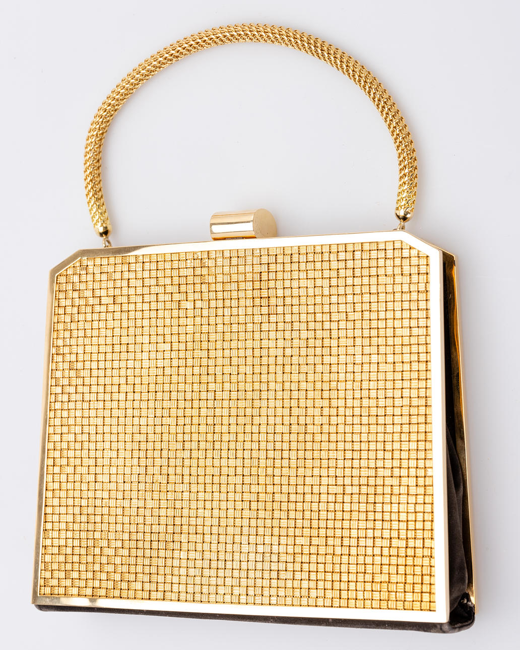 Vintage handväska, fodral och handtag av 750 guld. Mått ca. Längd x bredd x höjd: 17,5 cm x 4 cm x 25 cm Vikt ca. 688 gram.