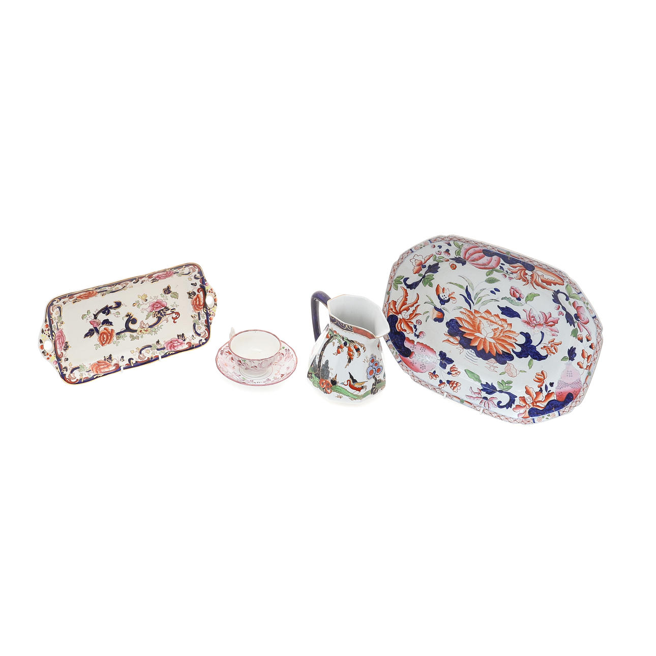 med snedställda hörn, 38cm x 30 cm, en viktoriansk Sunderland glans-tekopp och fat, en Losol Ware Imari-mönsterkanna, 17cm hög, och en Mason"s Mandalay-mönster rektangulär skål, 33cm bred (5)
