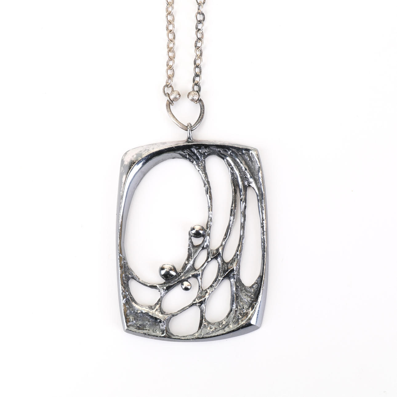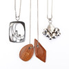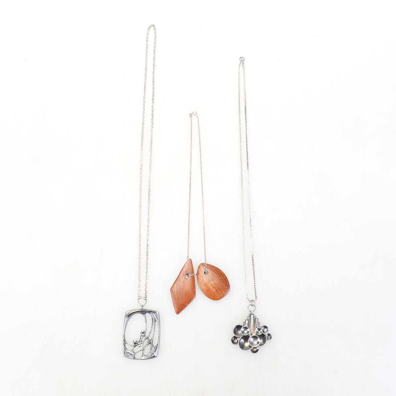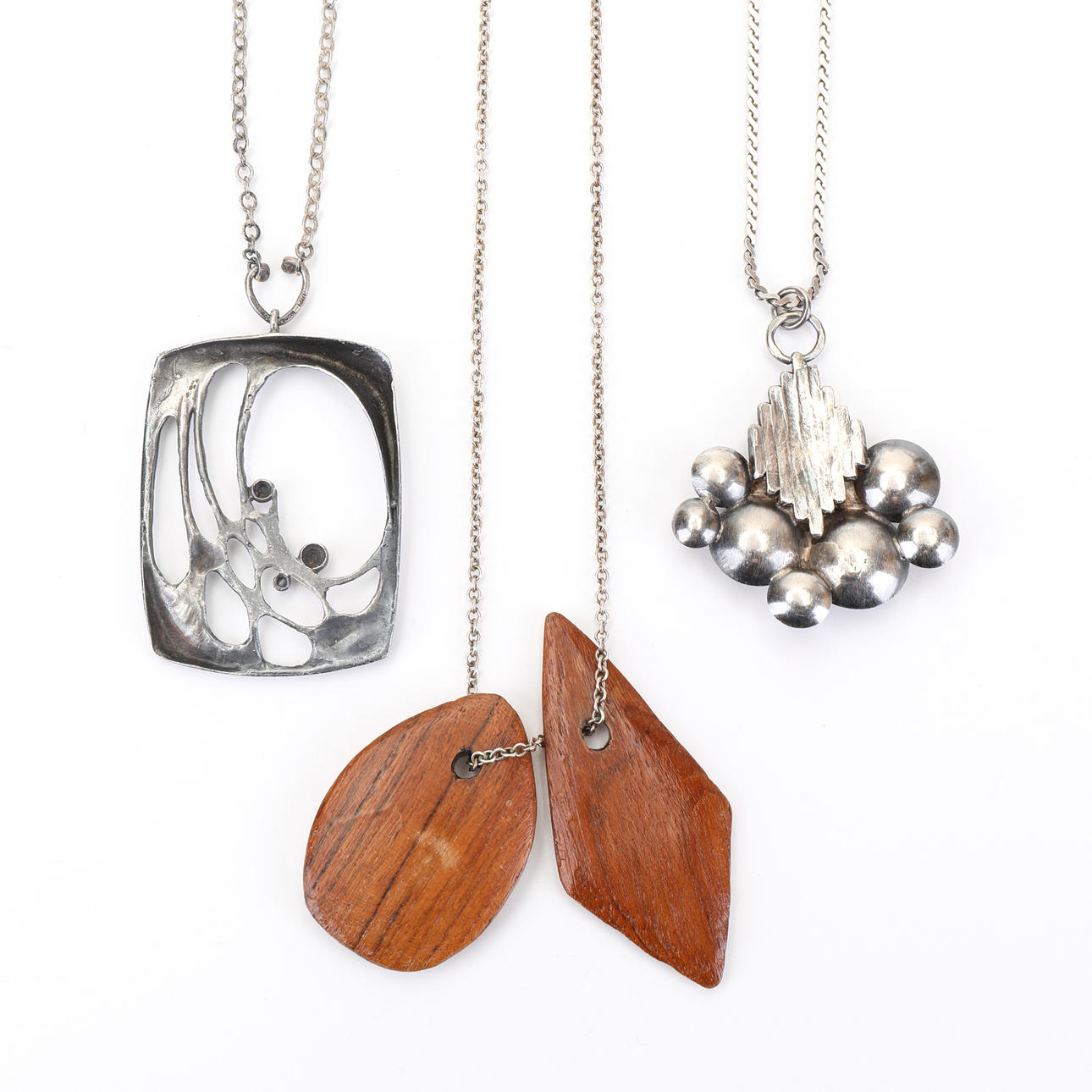 3 st större damhalsband. 70-tals design. Kedjorna på de längsta smyckena mäter ca 70 cm. På det kortare halsbandet hänger två plattor gjordan av teakträ.