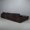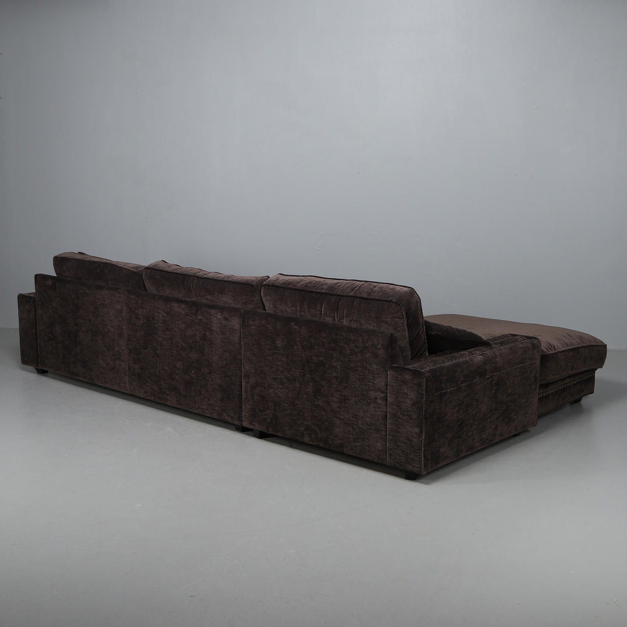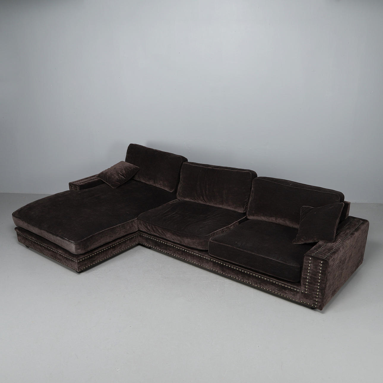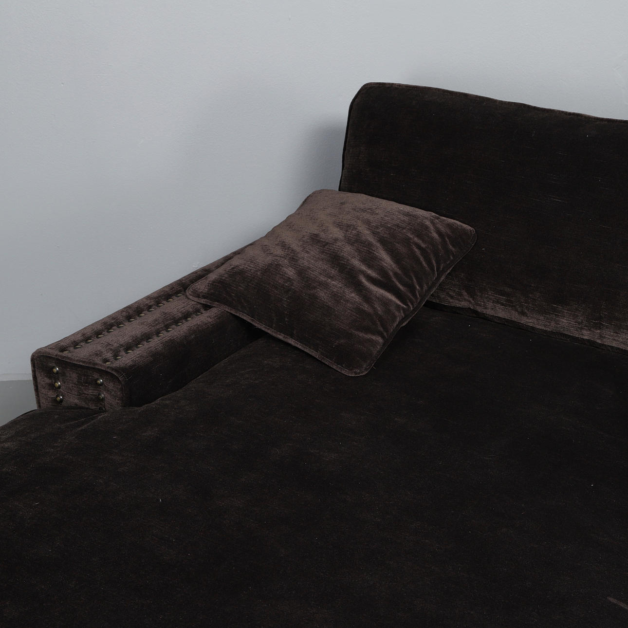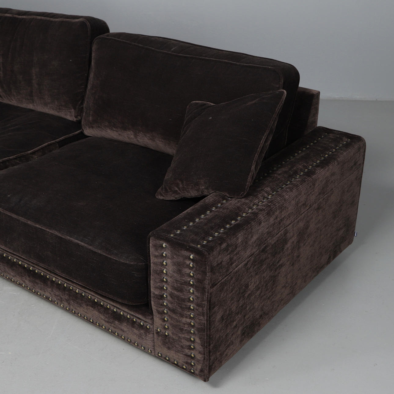 Helstoppad soffa klädd i ribbad brun sammet med nitdekor.