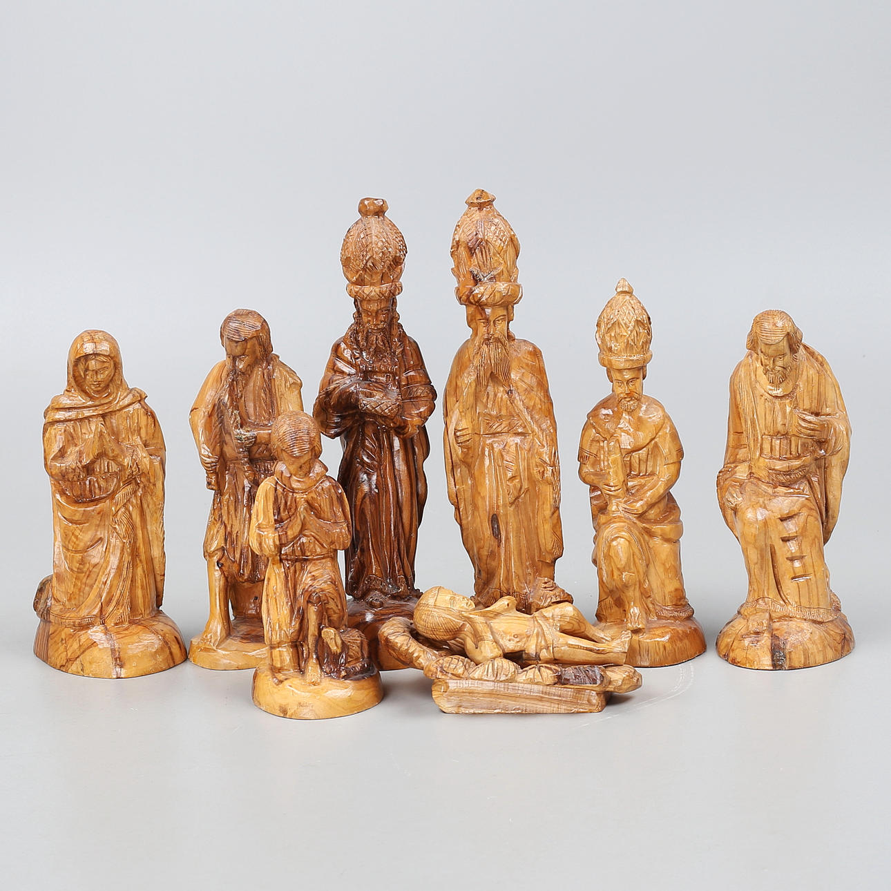 Krubba, höjd 48 cm, bredd 50 cm. Figurer, 12 st, höjder 8-28 cm.