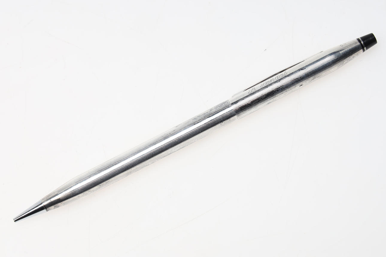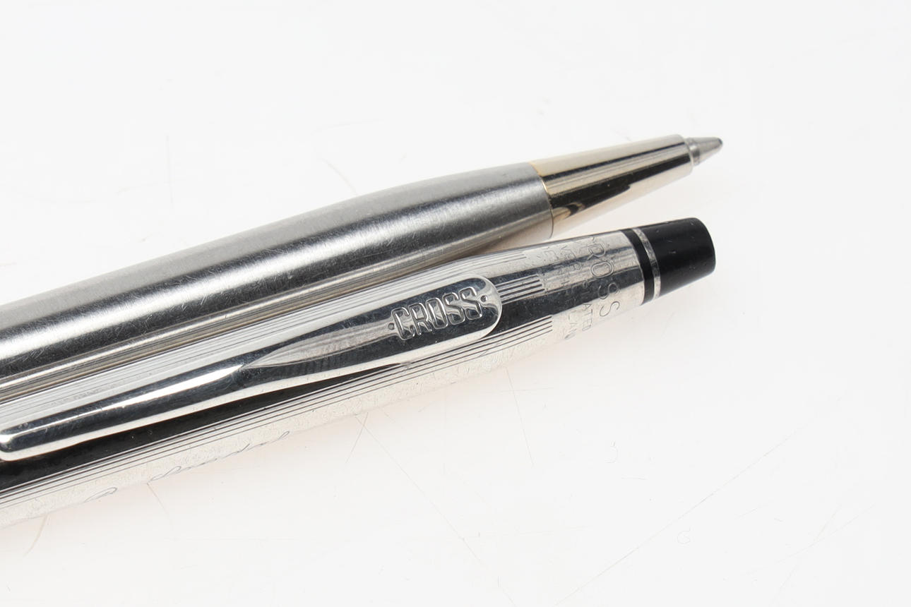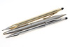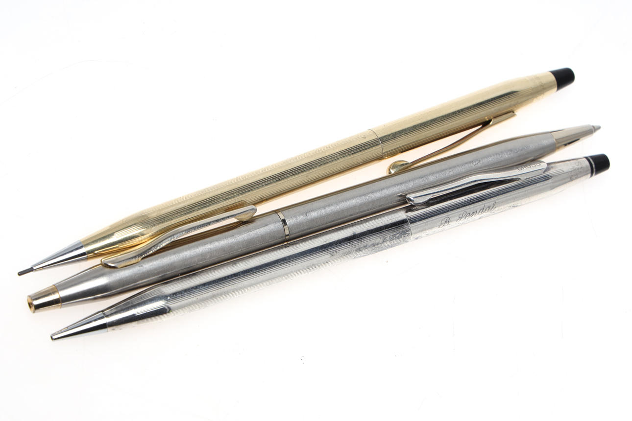 grafitstiftspennor, Cross, varav 1 penna i 10 Kt guldpläterad samt 1 penna silverpläterad. 1 kulspetspenna i borstat stål med guldpläterade detaljer. Längd ca 13,4 cm.