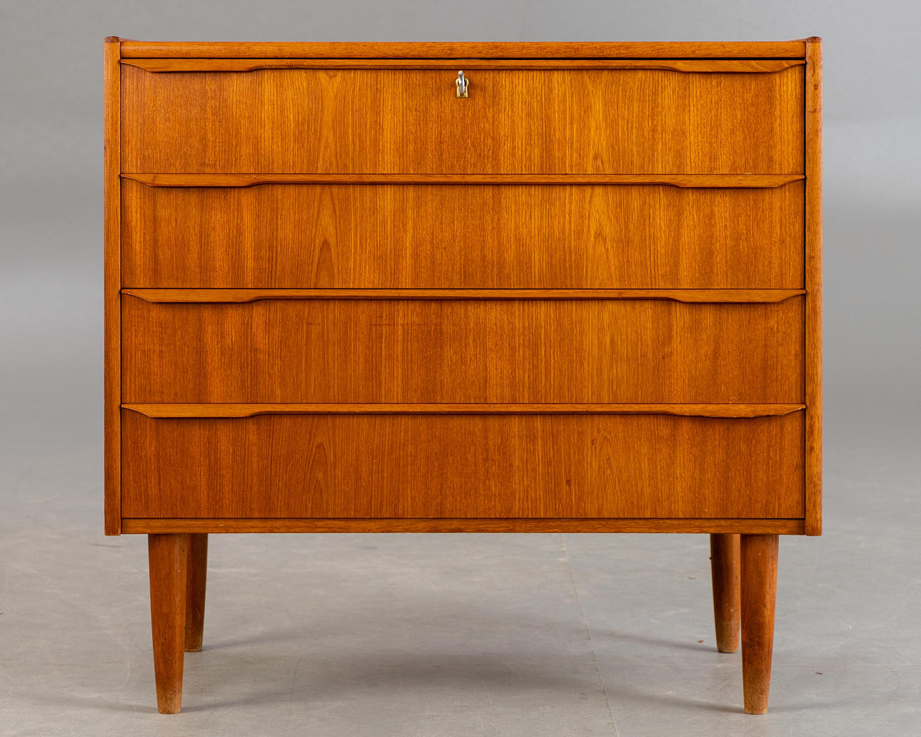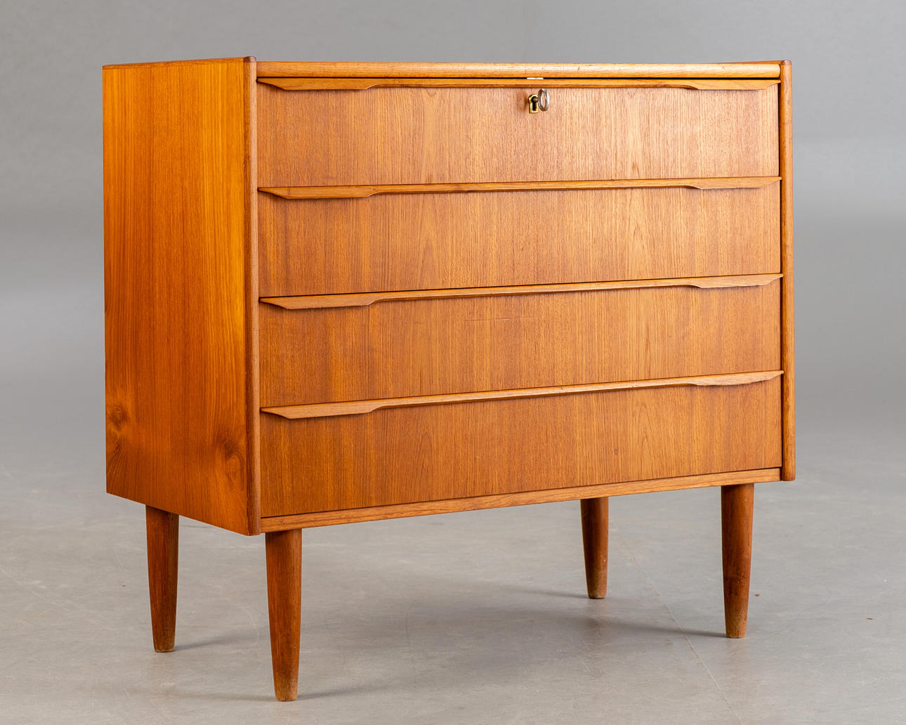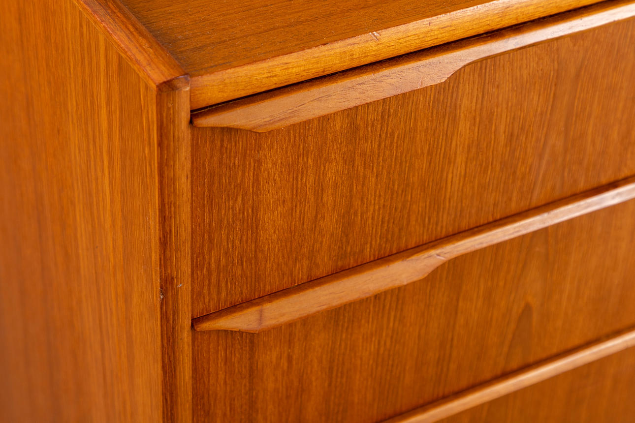 Liten teak byrå. Mitten av århundradet design 4-låda byrå med ben. Låsbar övre låda