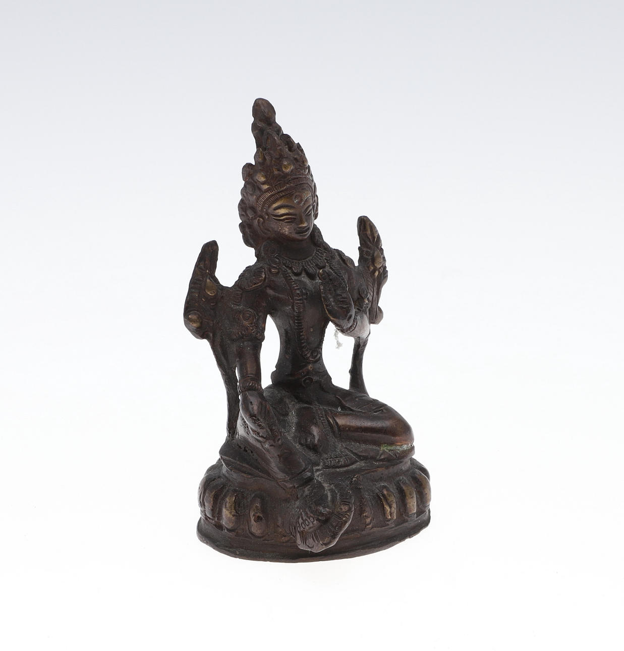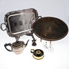 Att inkludera två pläterade brickor, (En med druva vinstockar dekoration och mäter 59 cm x 34 cm), en pläterad tekanna, En ljusstake hållare gjord av ett mässingsskal, en religiös brons figur och en trådcykel. (6).