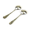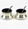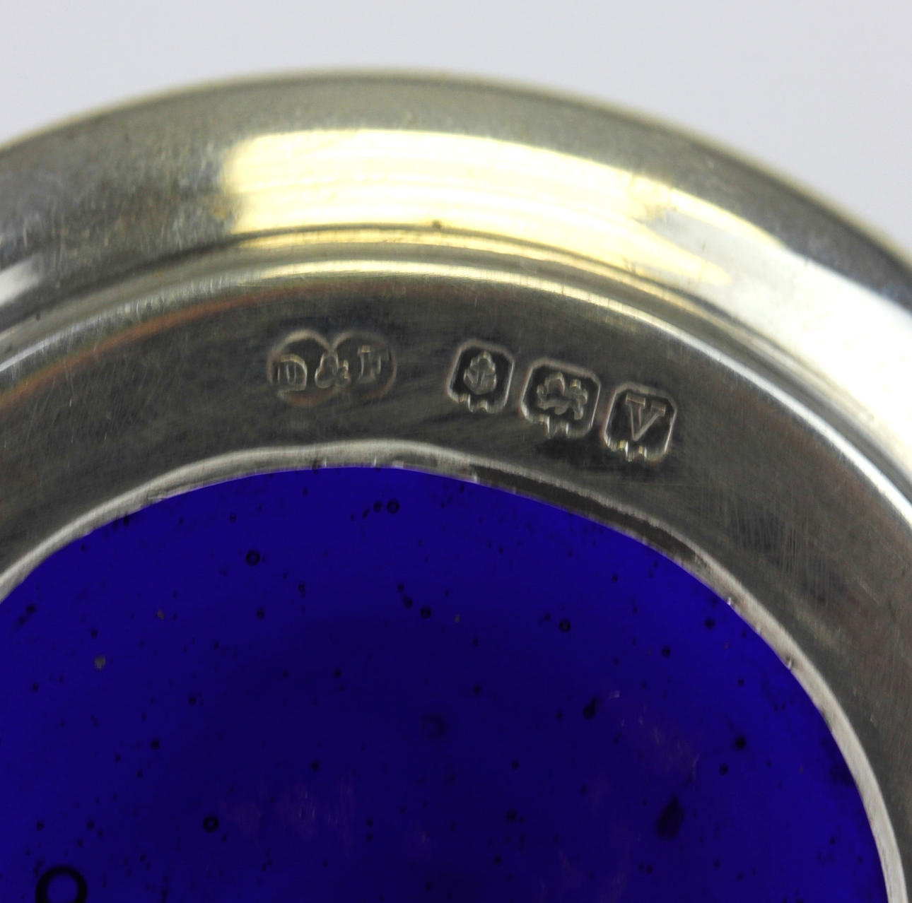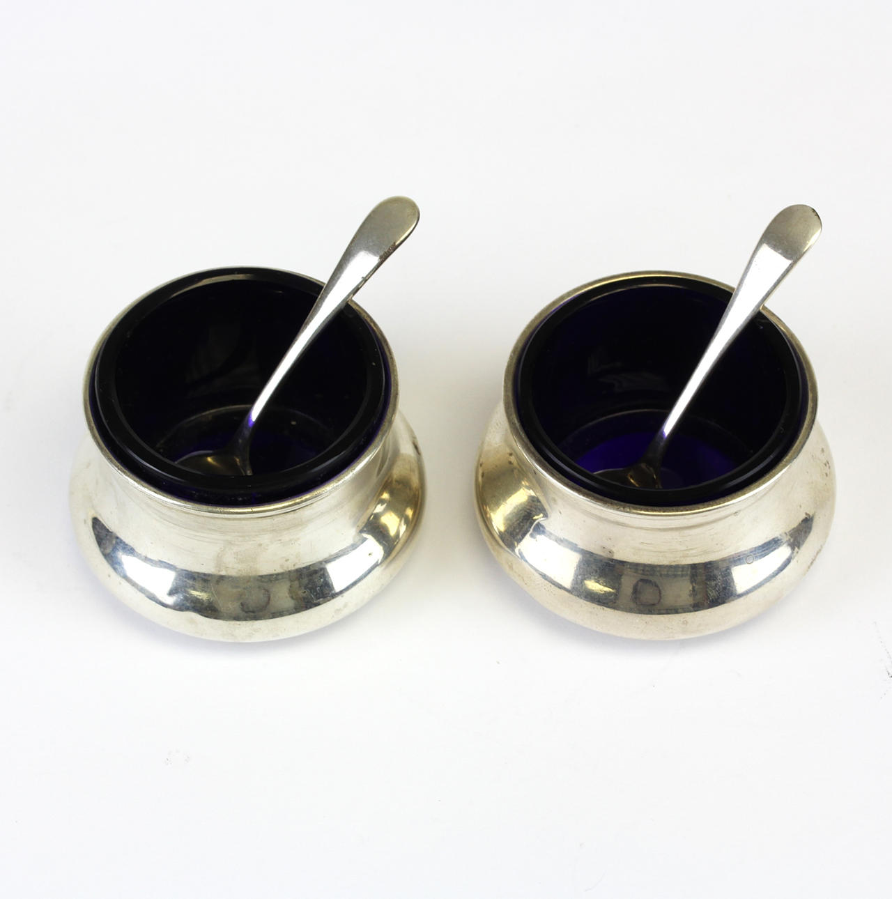 Två senapskannor i silver och blått glas samt två skedar, H. 3,3cm.