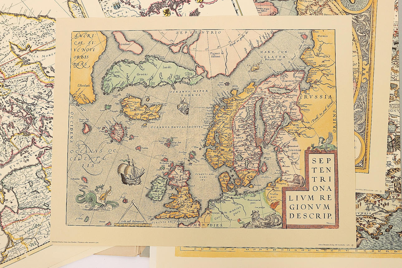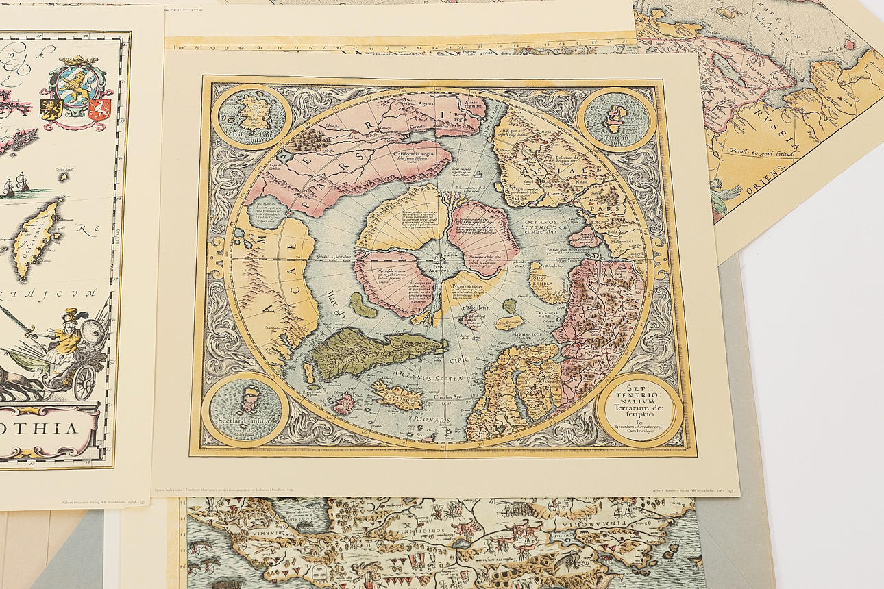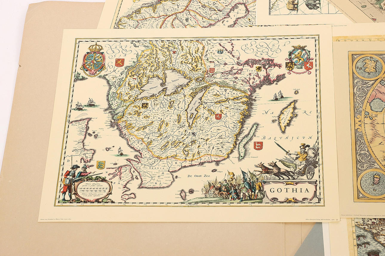 "Sex berömda kartblad", från 1500, 1600 och 1700-talen. Tryck, Bonniers 1967. Omslagsmappen mäter 65 x 57 cm.
