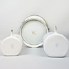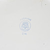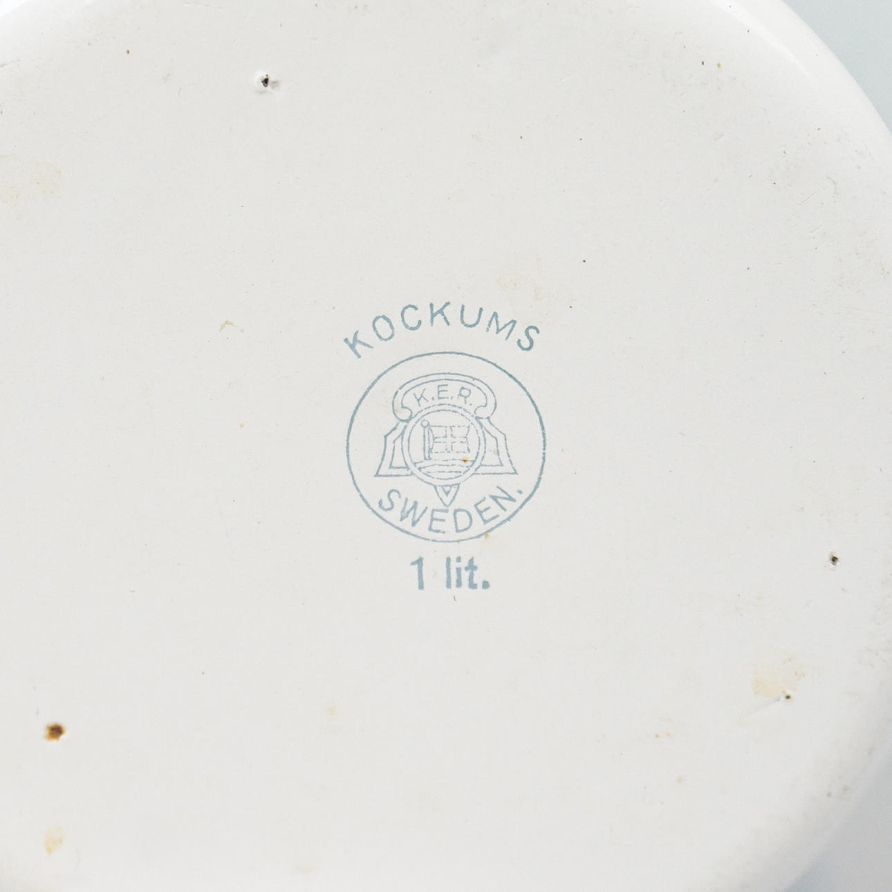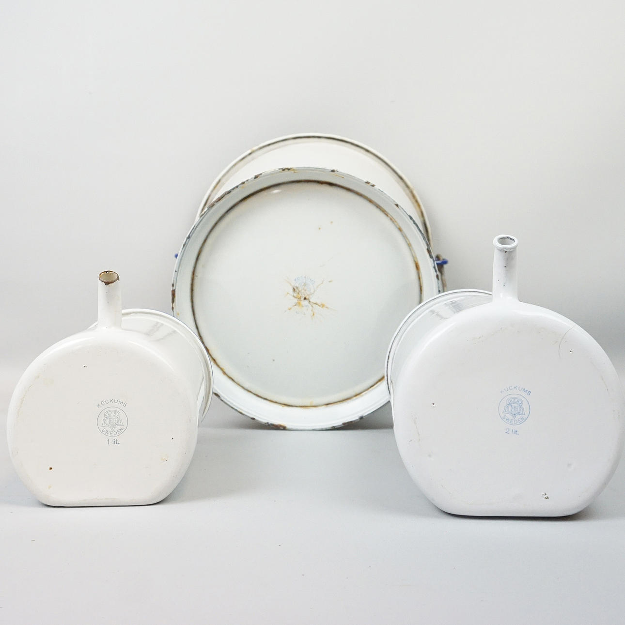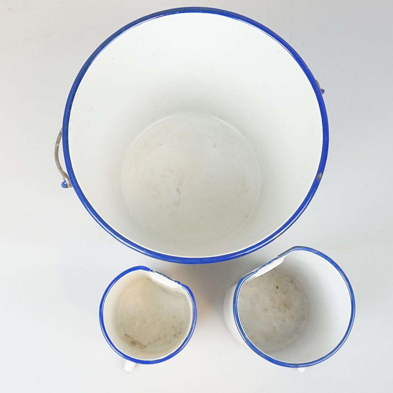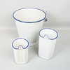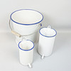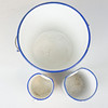 Hink, vit med blå kantdekor, höjd ca 26 cm, diameter ca 27 cm Lavemangskannor höjd ca 17 och 21,5 cm, diameter ca 11 cm och 13 cm.