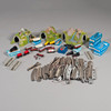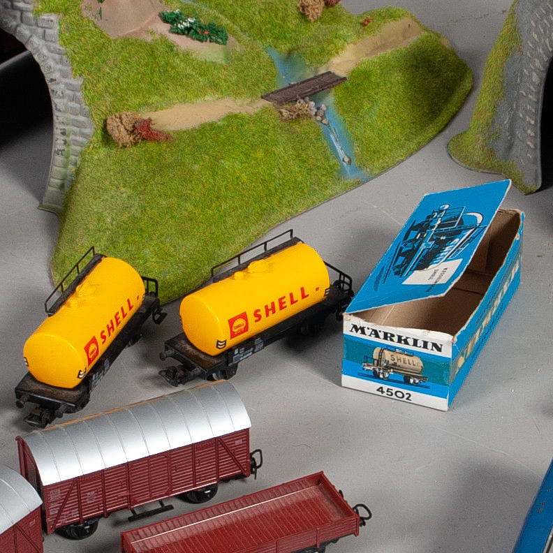 tre stycken tåg, 11 vagnar, två stycken tunnlar samt räls ca 70 delar, enstaka broar samt växelspår. transformator.