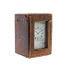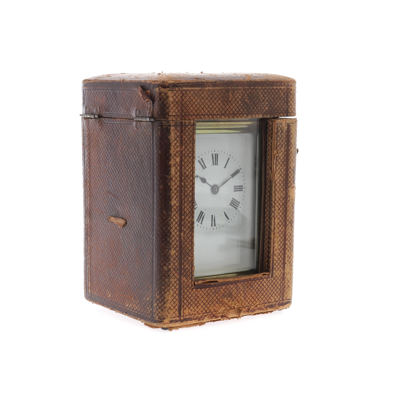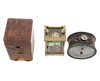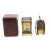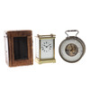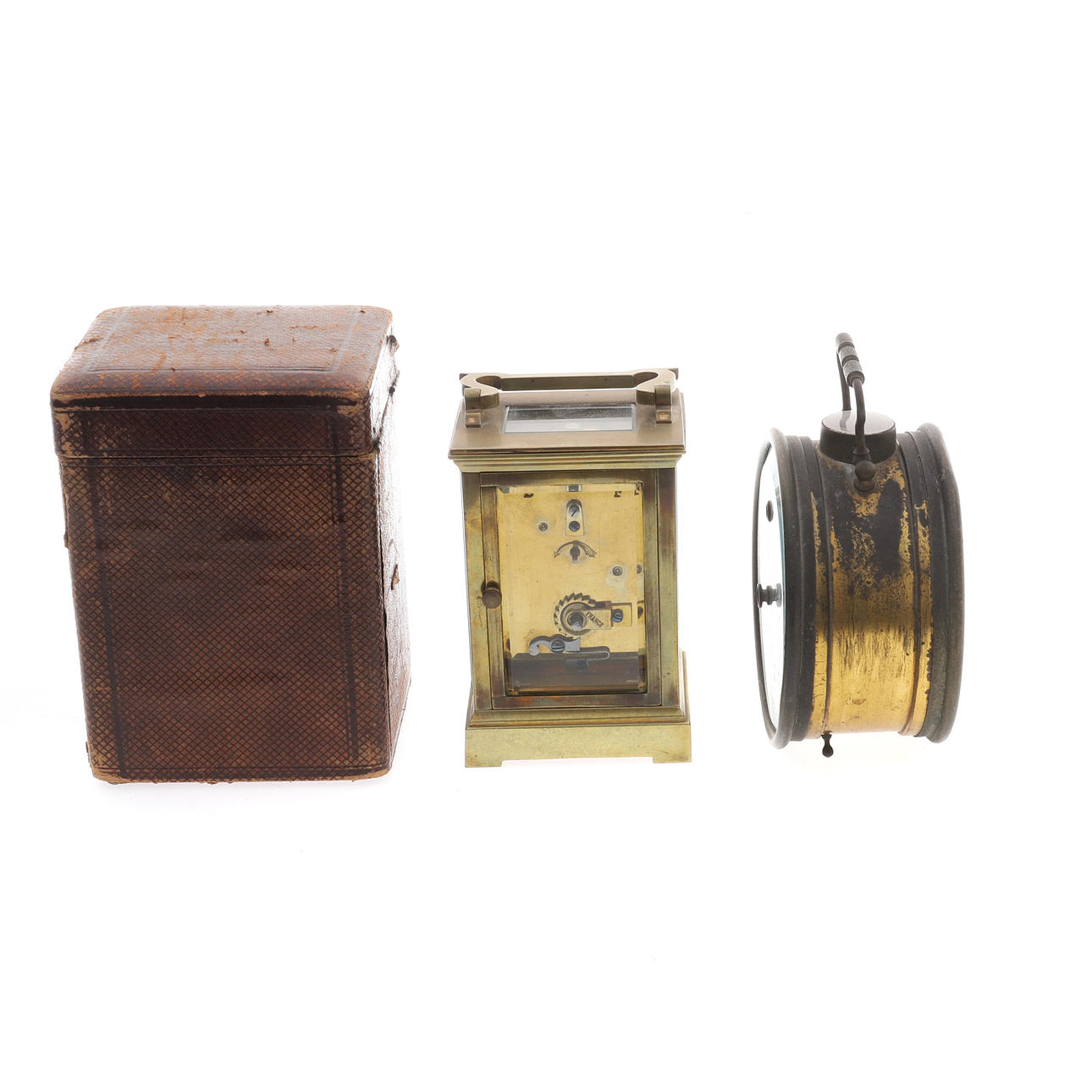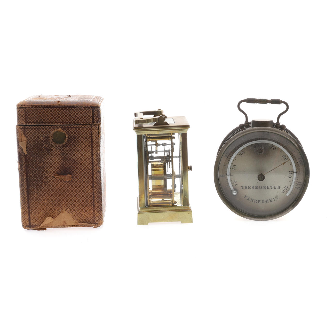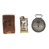 den vita emaljskivan med romerska siffror, 15cm hög, med nyckel, i en tärnad läder täckt väska, och en fransk förgylld metalltrumma höljet aneroidbarometer och termometer, slutet av 1800-talet, överträffad av en kompass, 14cm hög (2)