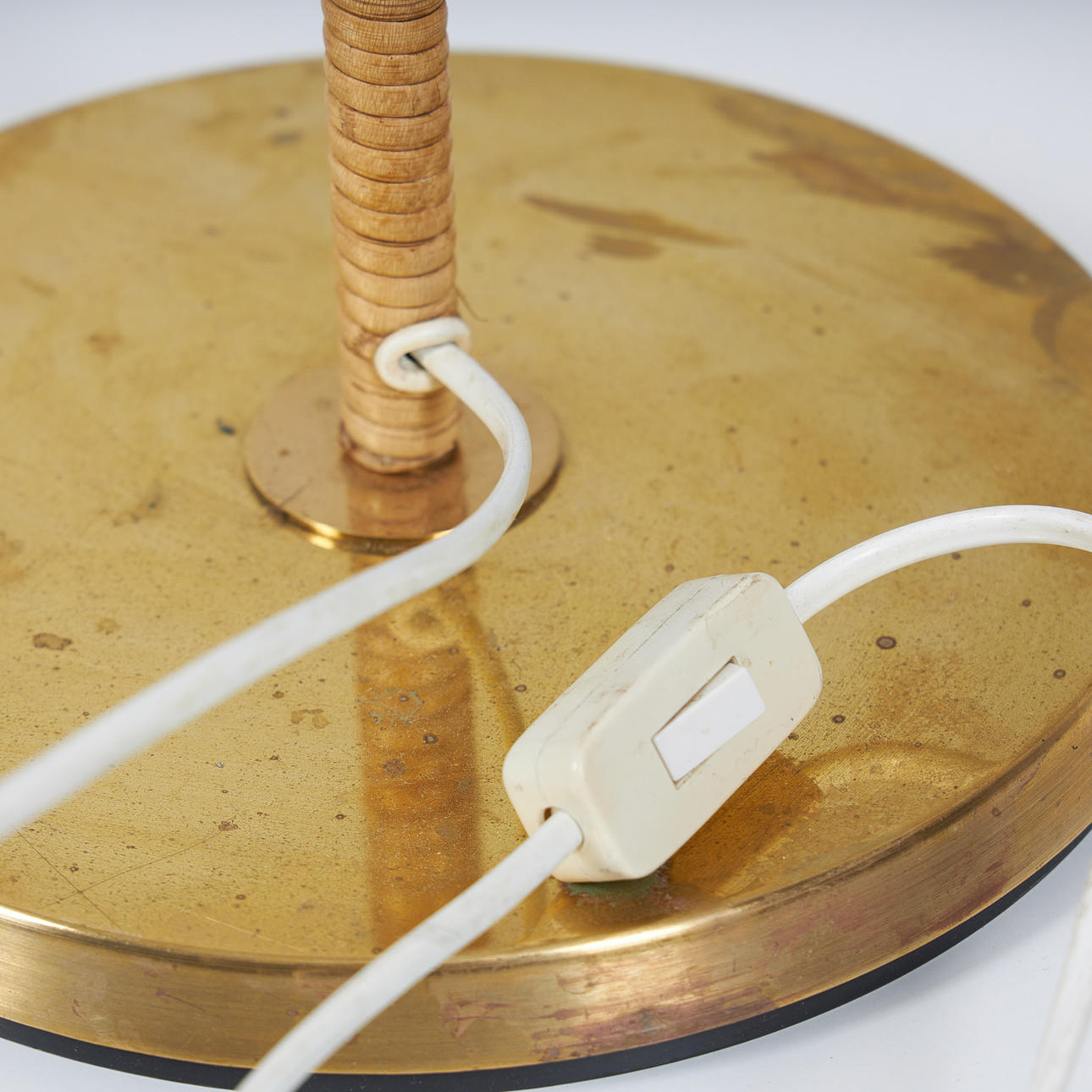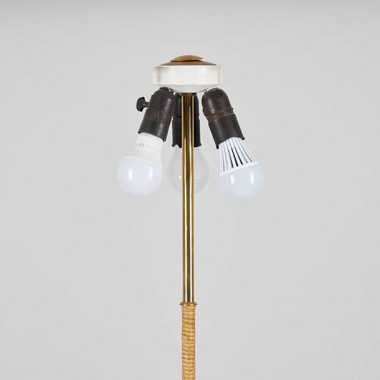 För tre ljuspunkter, skaft med tvinnad rotting, polerad mässing, höjd 164 cm. Rotting skärm diameter 90 cm.