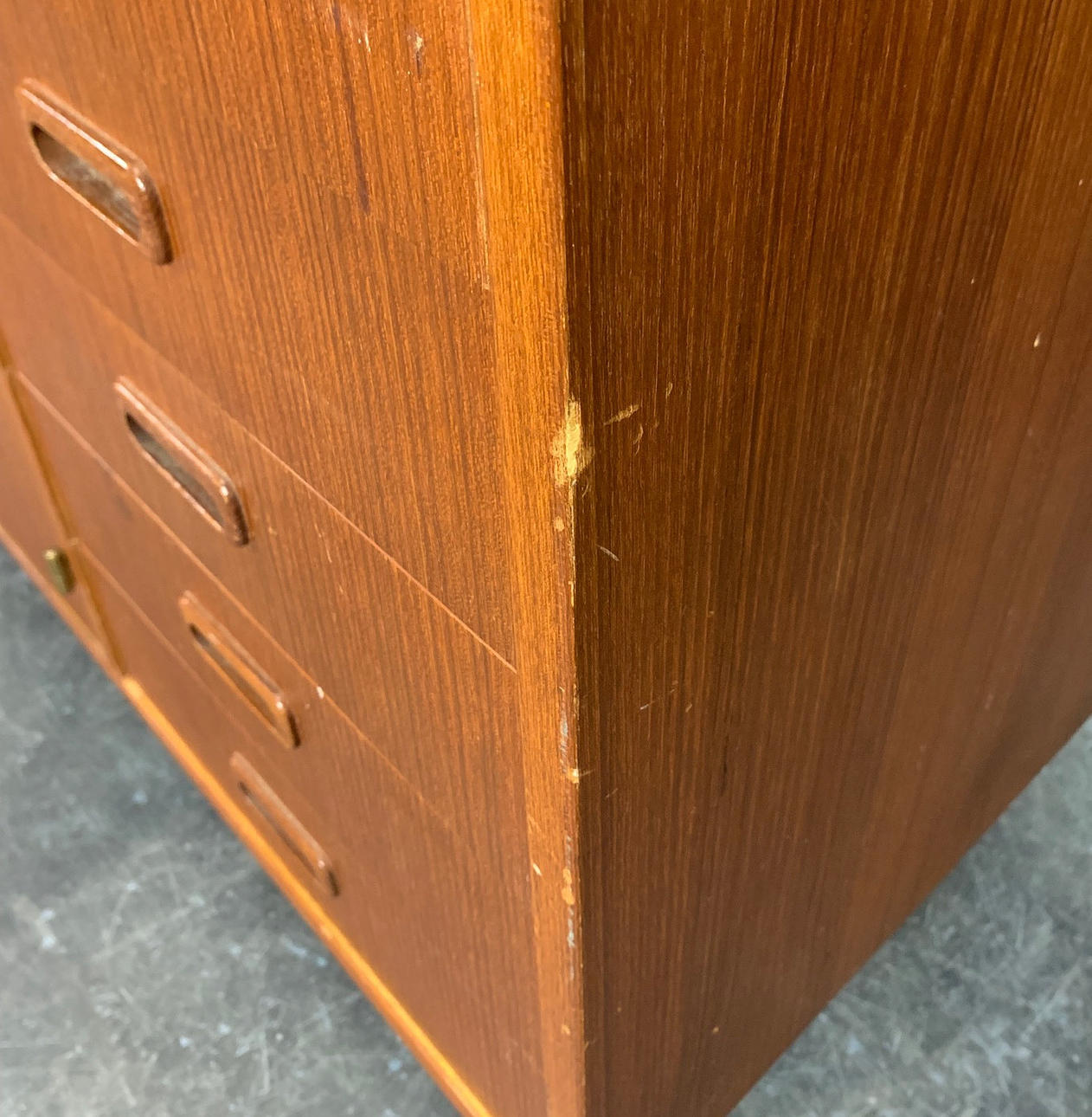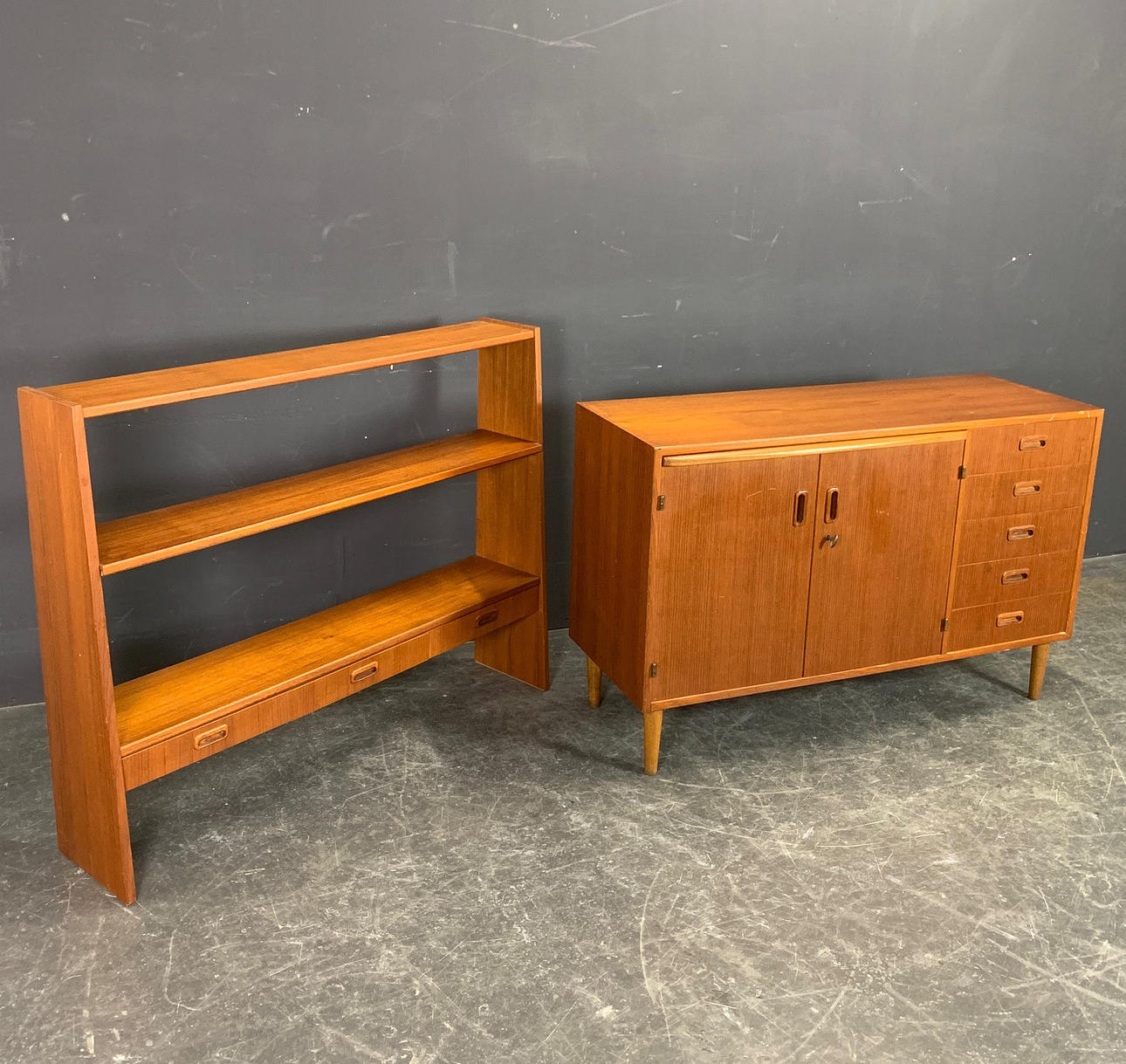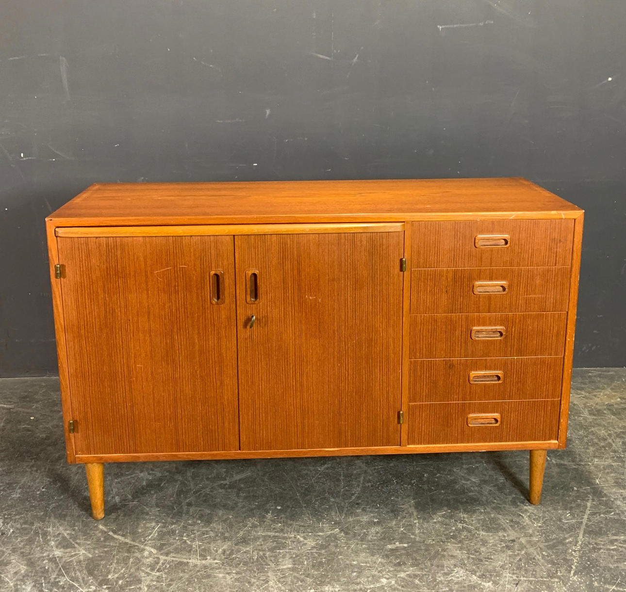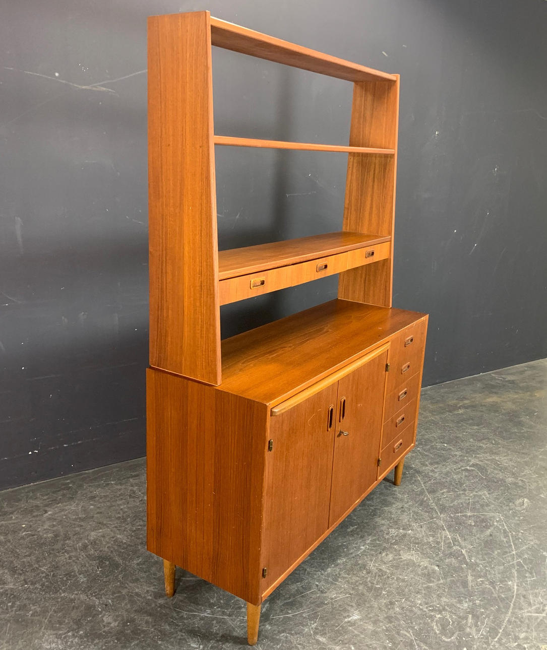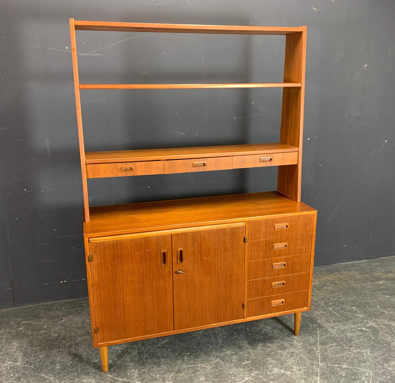 Teakfanér version från Danmark Höjd med infästning ca. 171.5 cm, utan infästning ca. 78 cm, djup ca. 42 cm, bredd ca. 120 cm.