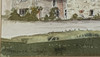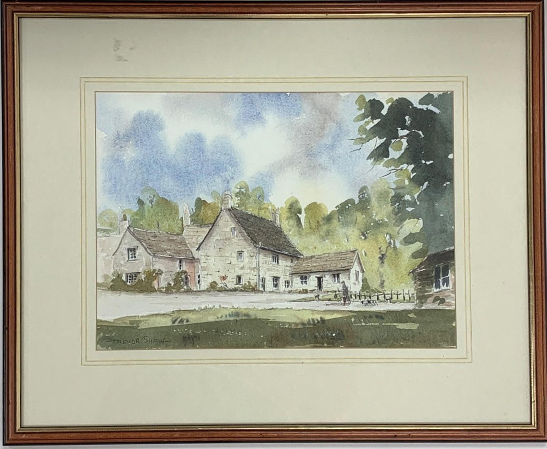 En inramad akvarell av Cotswold Farm av Trevor Shaw, ramstorlek 53,5 x 43,5 cm.