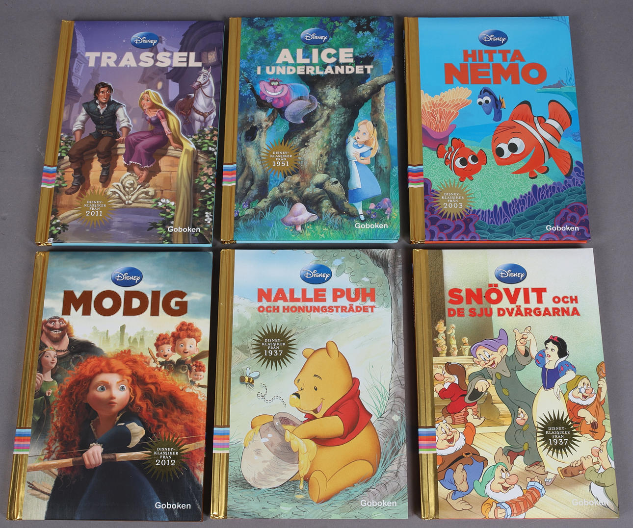 Trassel, Hitta Nemo, Modig, Nalle Puh och honungsträdet, Snövit och de sju dvärgarna, Djungelboken, Pinocchio, Dumbo, Lady och Lufsen, Alice i underlandet, Tingeling -Vingarnas hemlighet & flygplan.