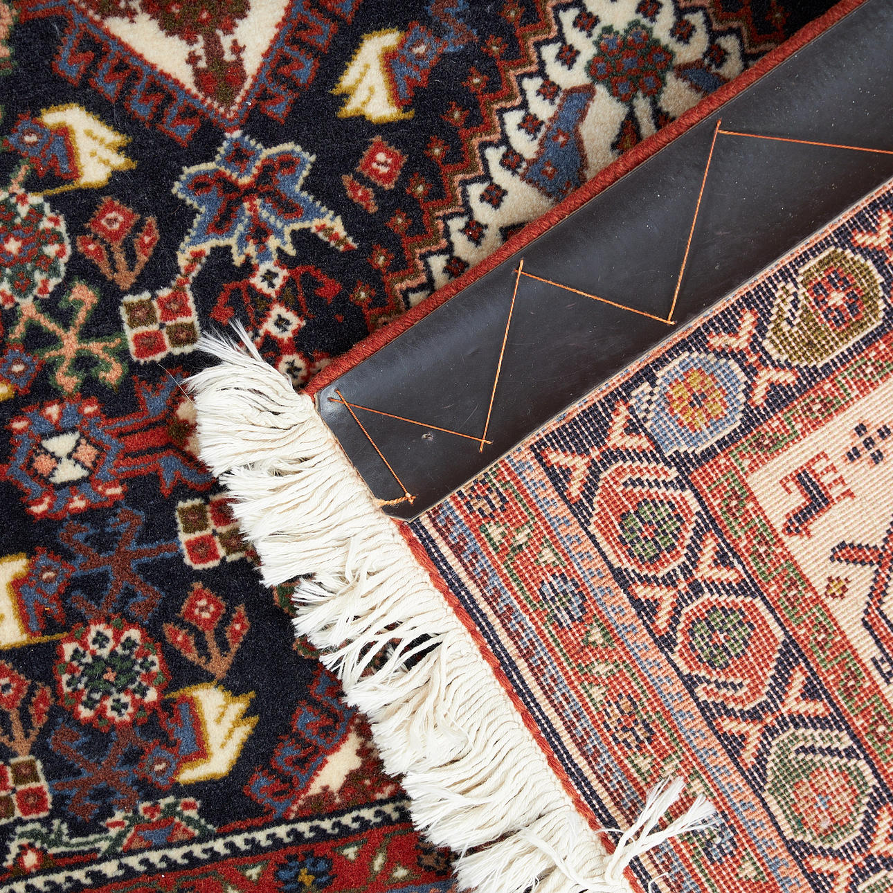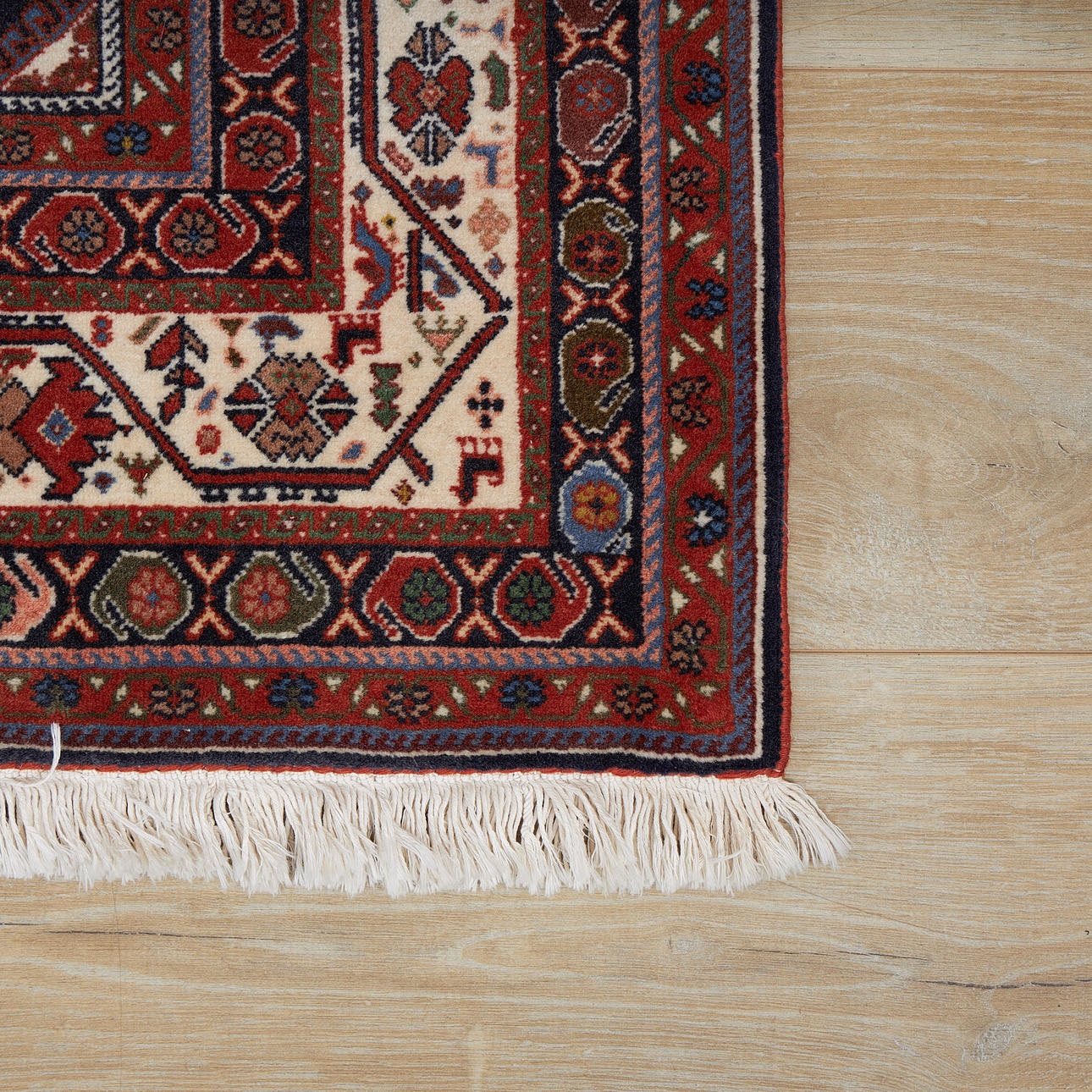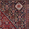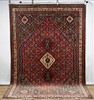 Rikligt geometrtiskt mönster på rött botten, 295 x 200 cm.