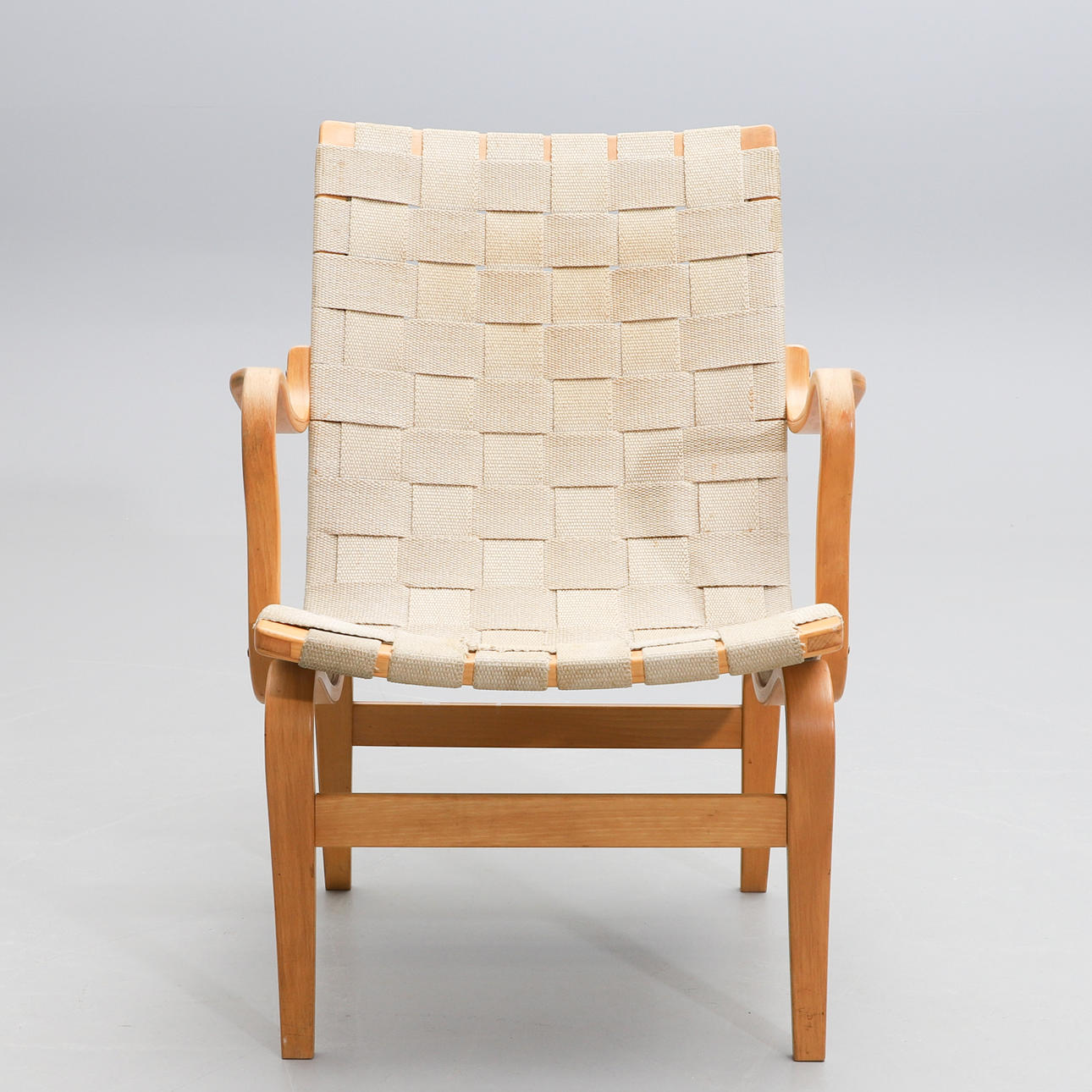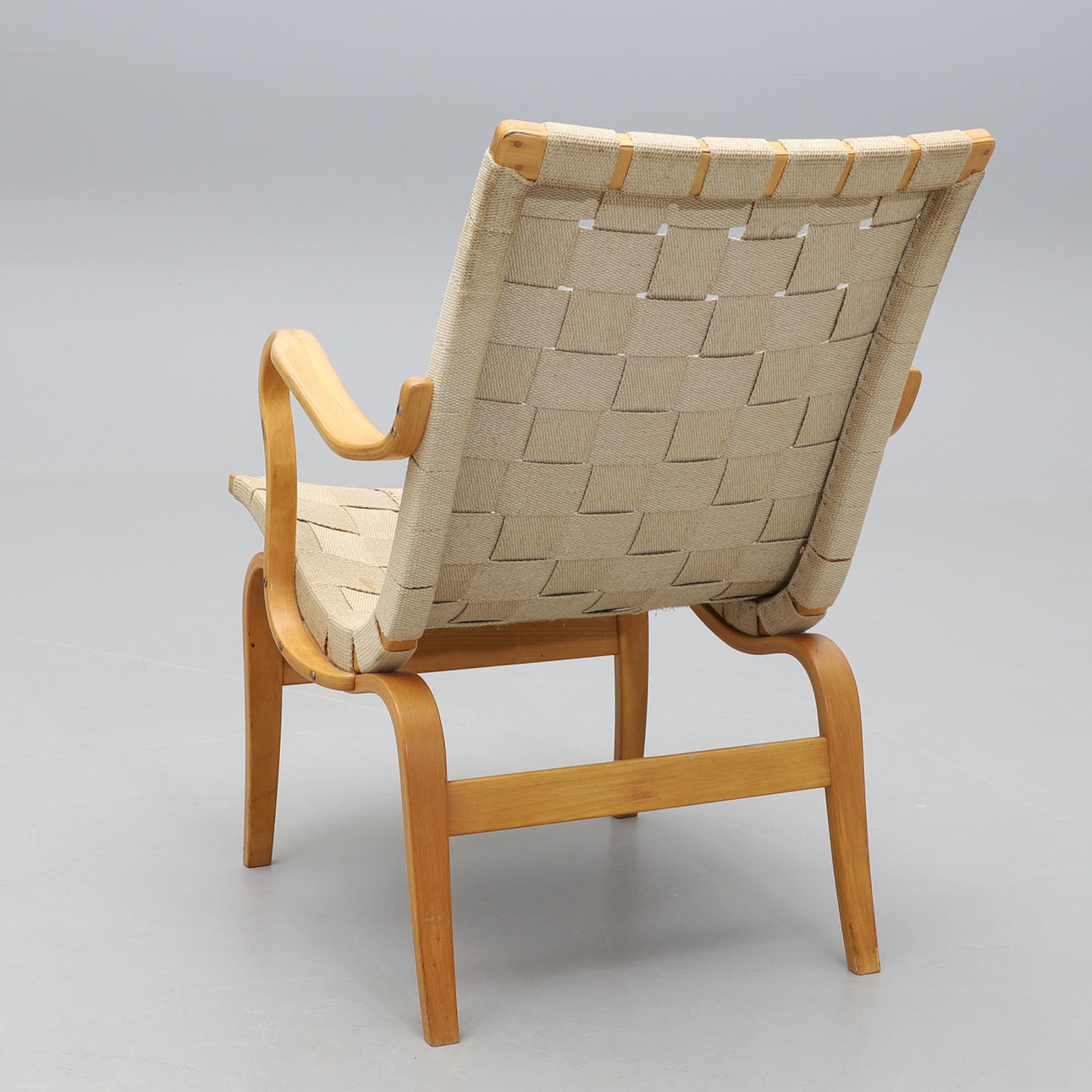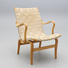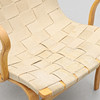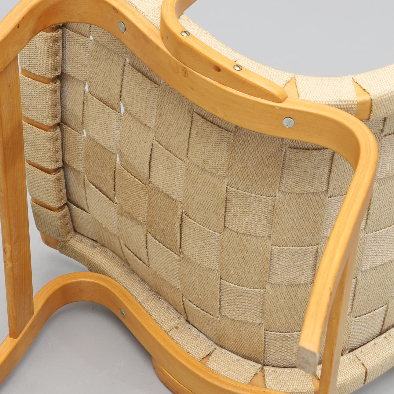Böjträstomme i bok. Sits och rygg av flätad sadelgjord. Bredd 59, sitthöjd c:a 39 cm.