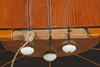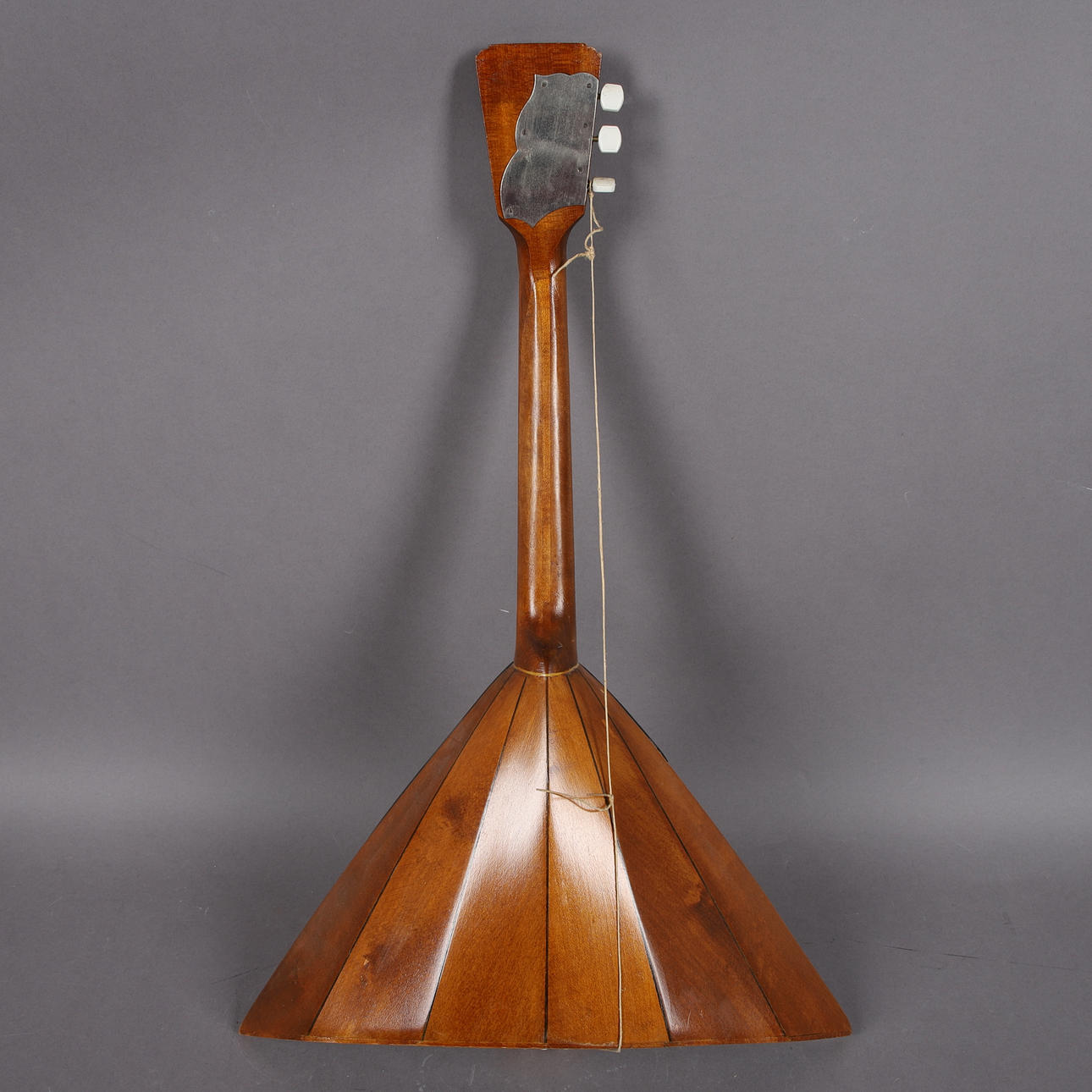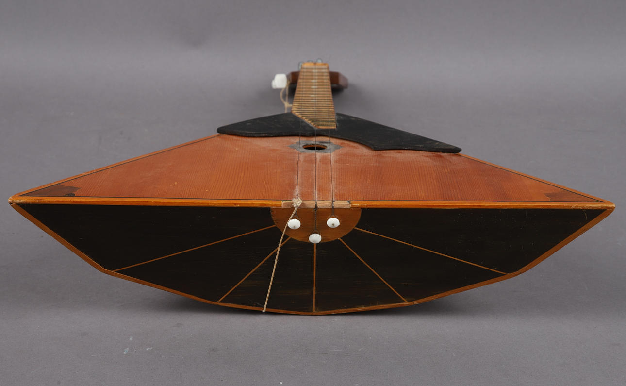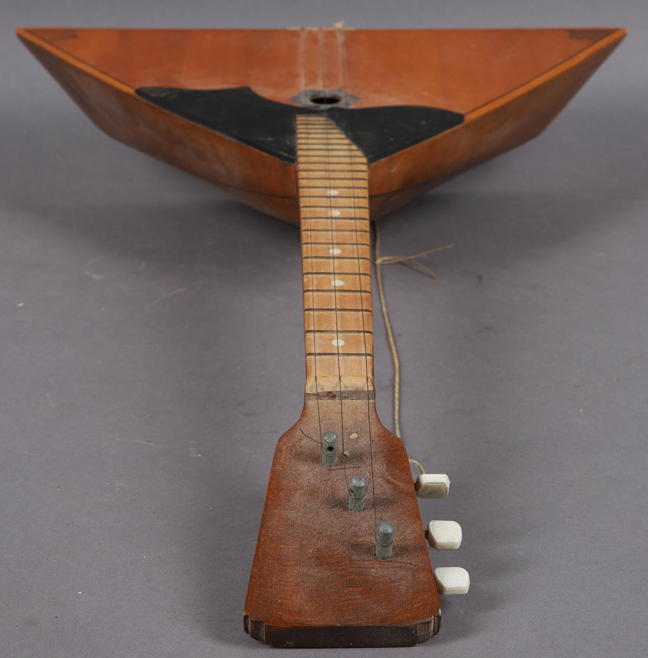 Stallet till strängarna saknas på Balalajkan, ytsmuts, ytslitage.