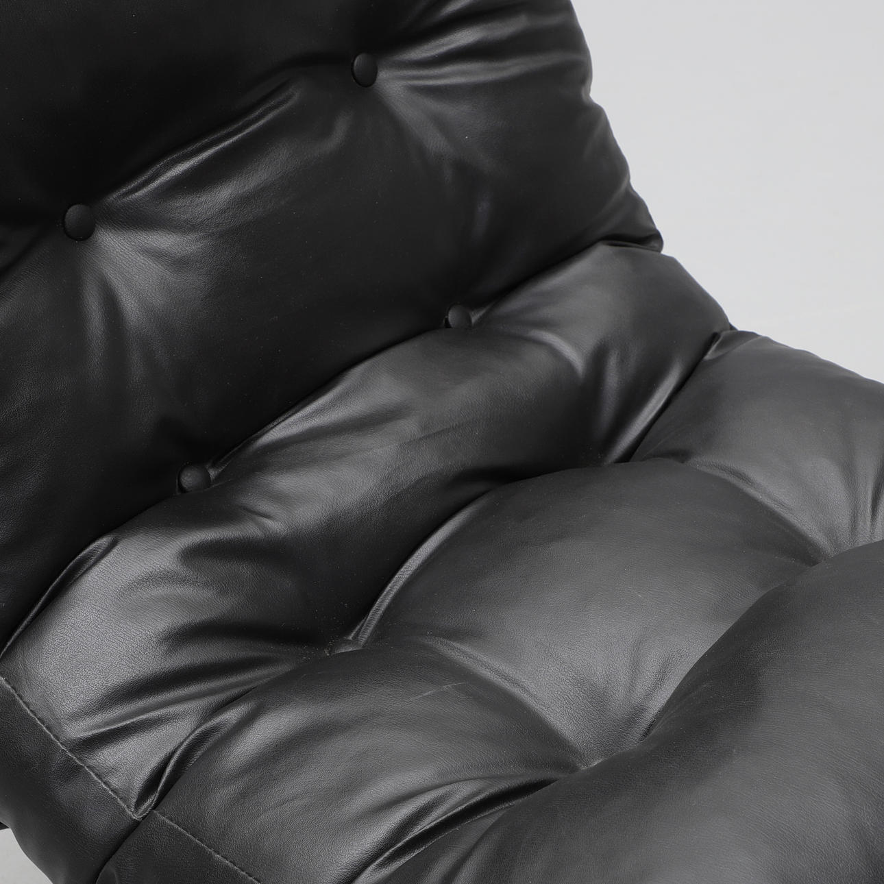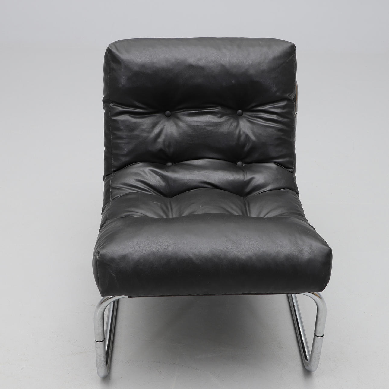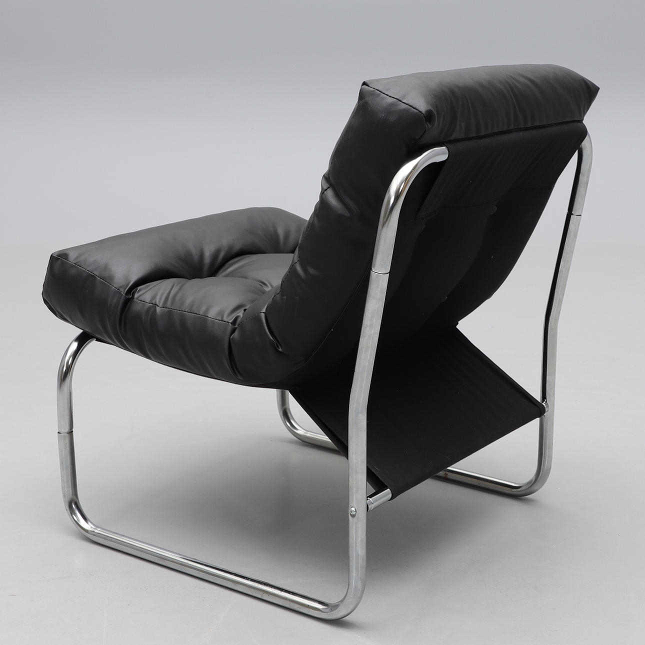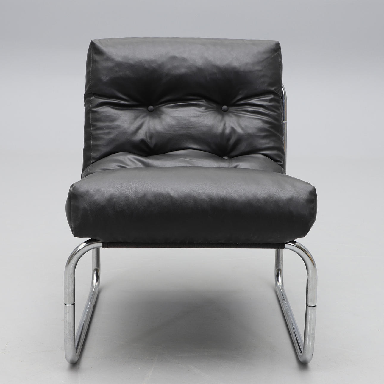 Kromad stålrörsstomme, stoppad dyna klädd i svart konstläder. Bredd c:a 54, sitthöjd c:a 46 cm.