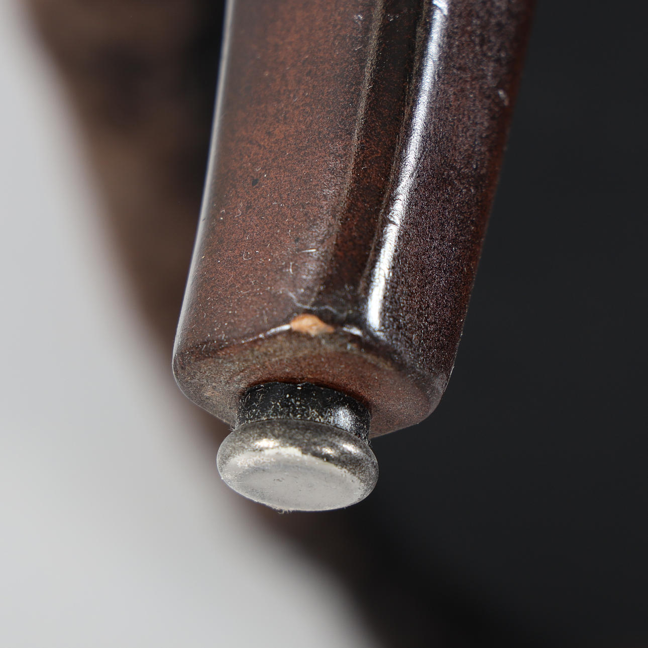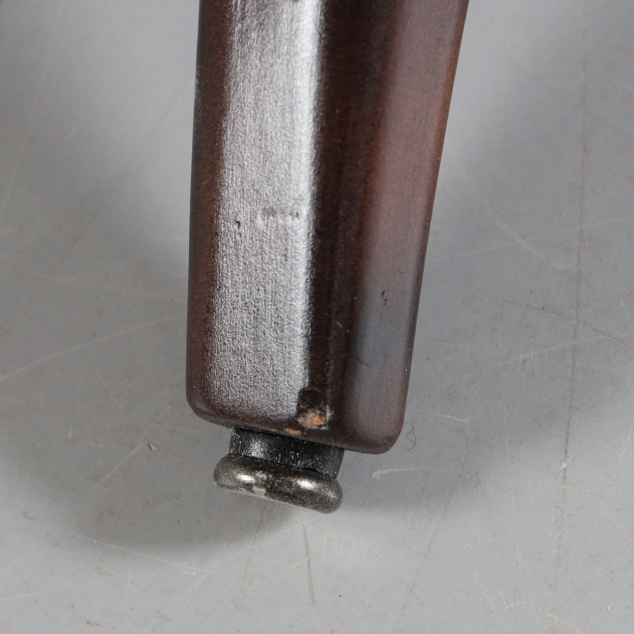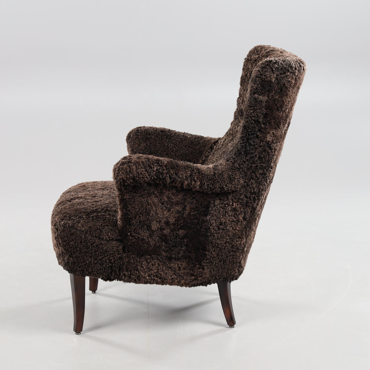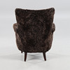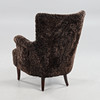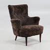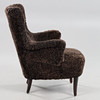 Nyrenoverad och nytapetserad med chokladbrunt fårskinn. Ben i mörkbetsad bok. Brickmärkt Carl Malmsten samt O.H. Sjögren, Tranås.