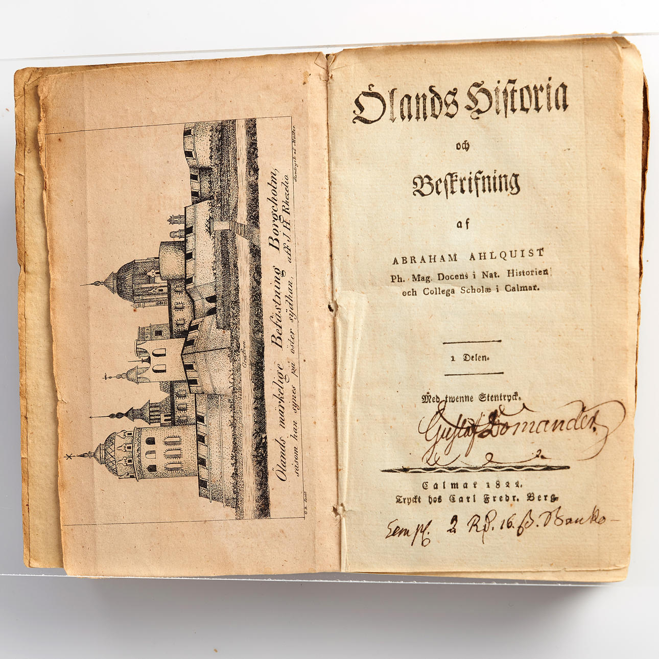Daniel Djurberg, Geografi för begynnare. 7:e uppl. Örebro 1815 (7) 1-492 (reg. 493-519). Hfrbd. Namnt. + Abraham Ahlquist, Ölands historia. I (II utk). Kalmar 1822. (12), 81)-450. 2 lit. plr (alla). Blått omslag med skador.