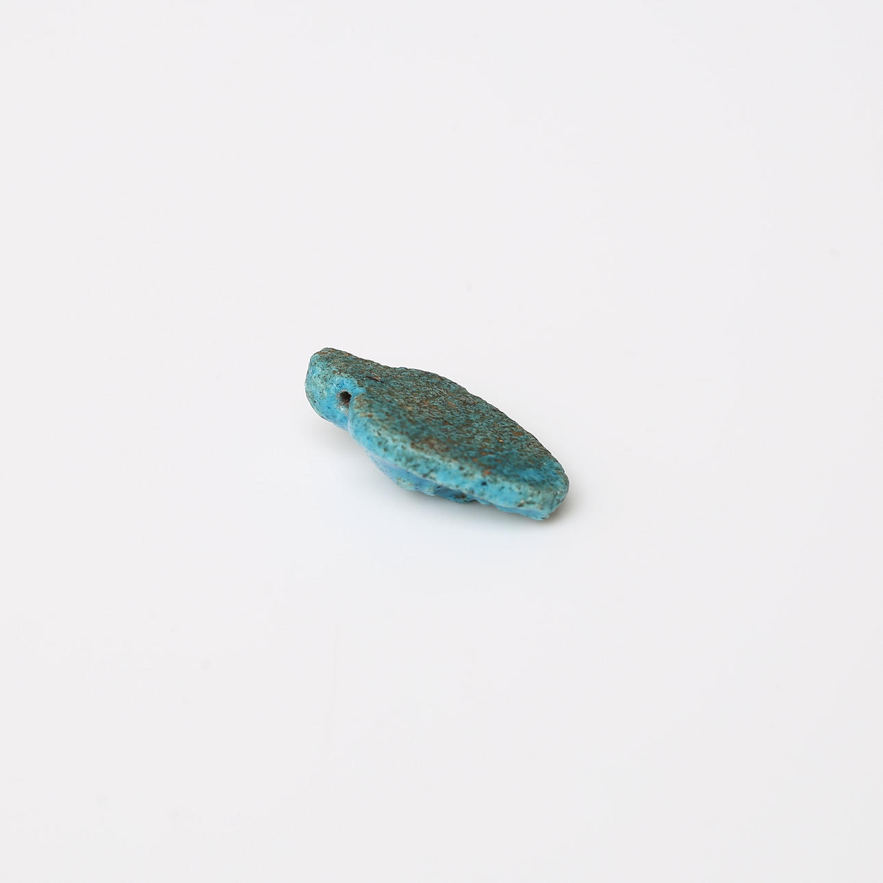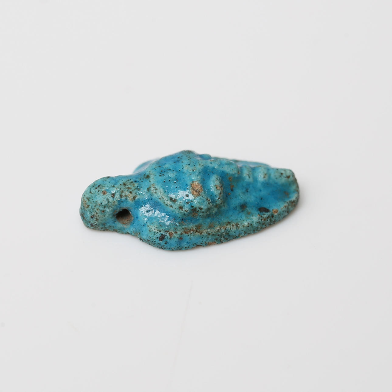 Blåglaserad och med dekor av gudom, längd 2 cm.