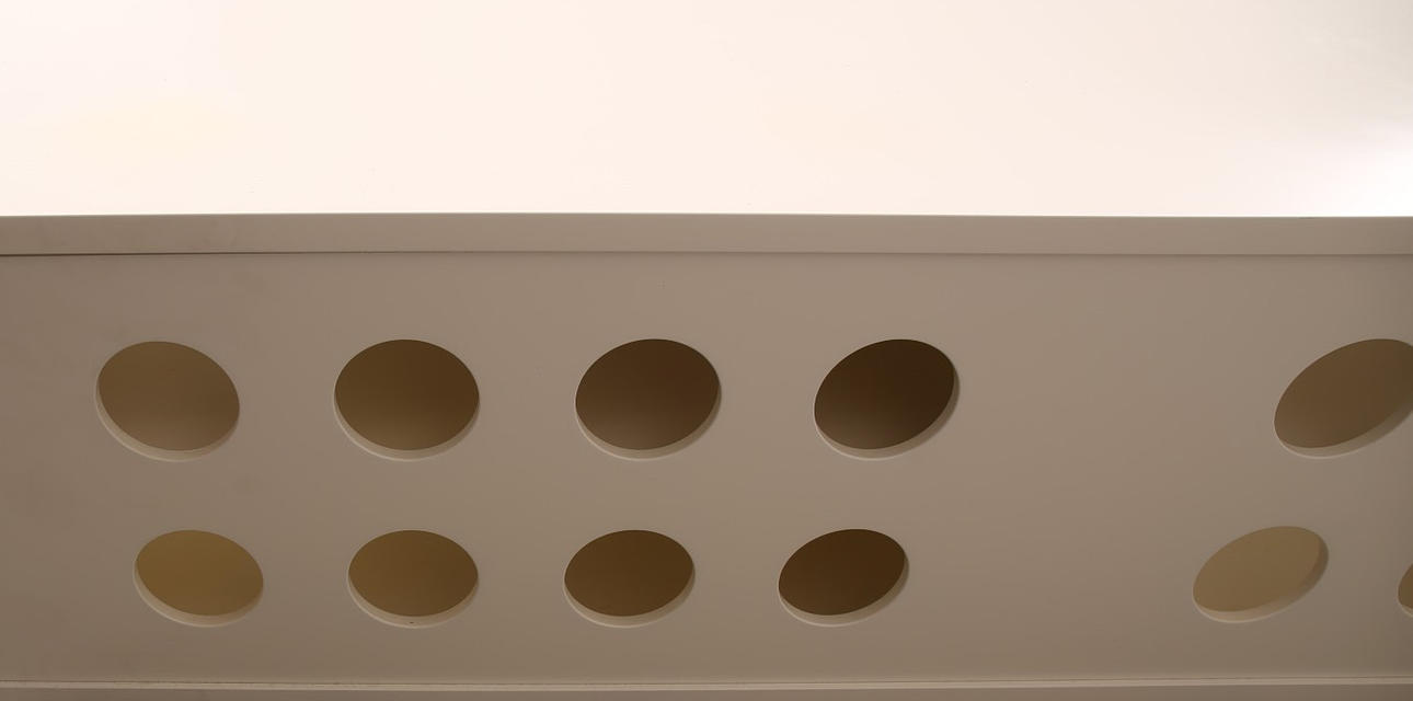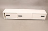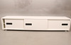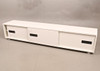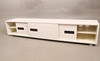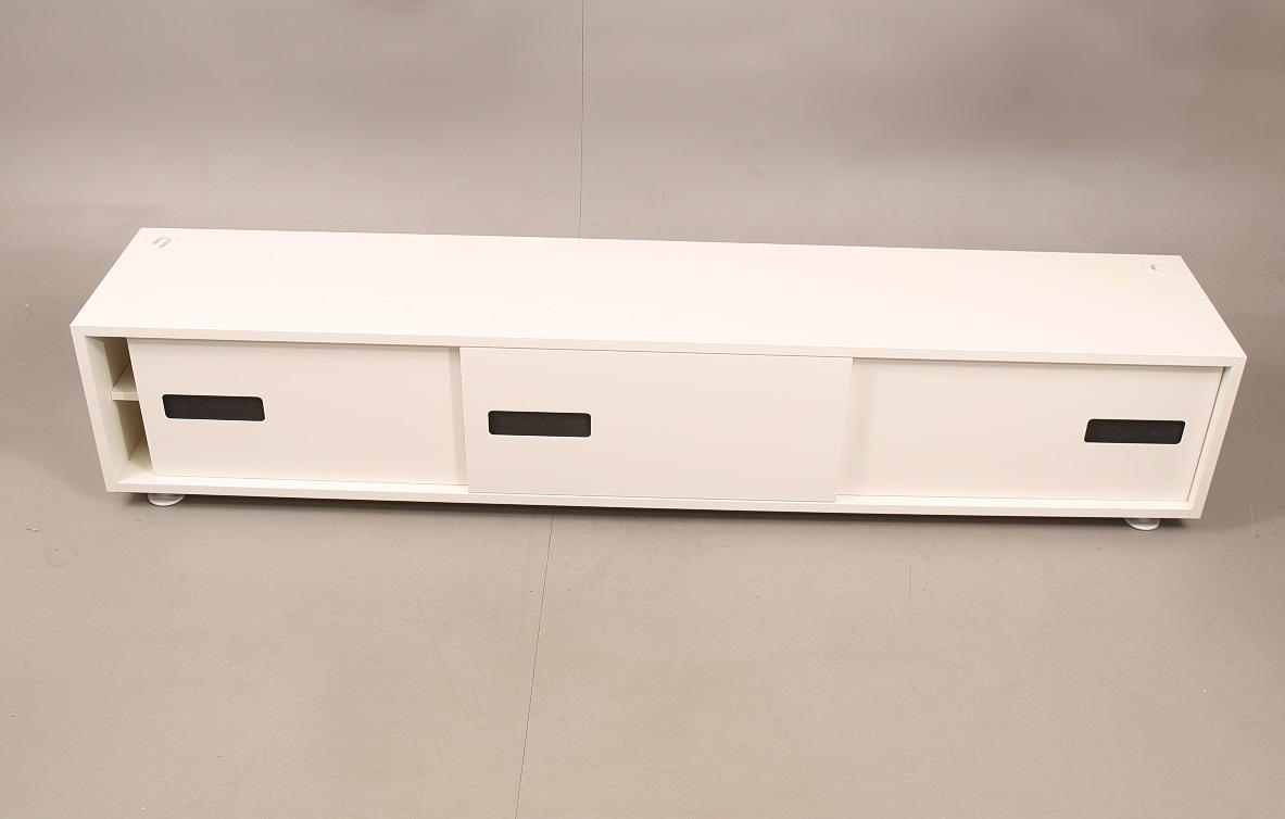 Vitlackerad mdf, fronten med tre skjutbara dörrar, längd 236, bredd 45, höjd 46 cm.
