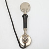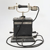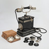 En gammal telefon med ett antal tillbehör såsom en ringsignalsförstärkare, mikrofoner och en liten lur.