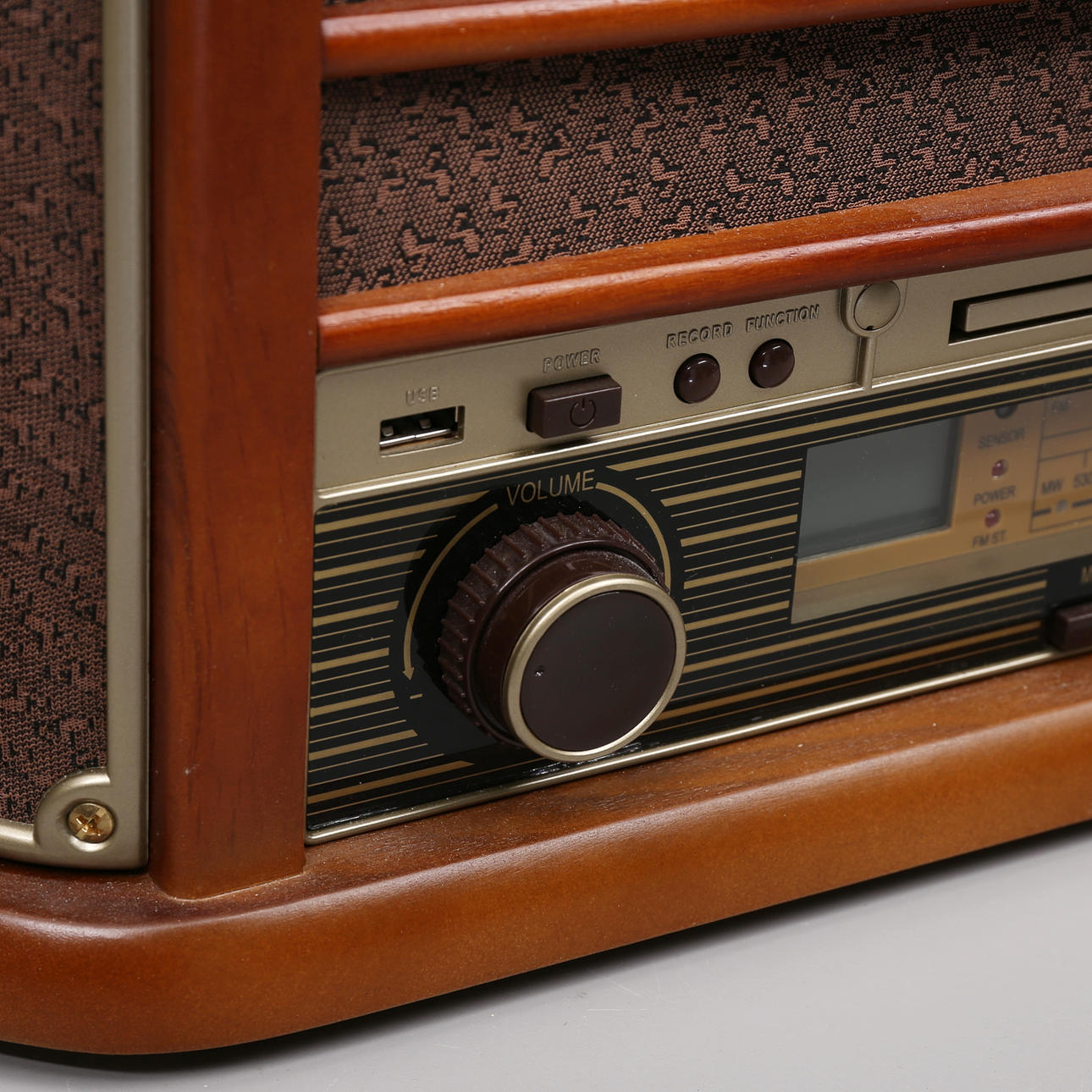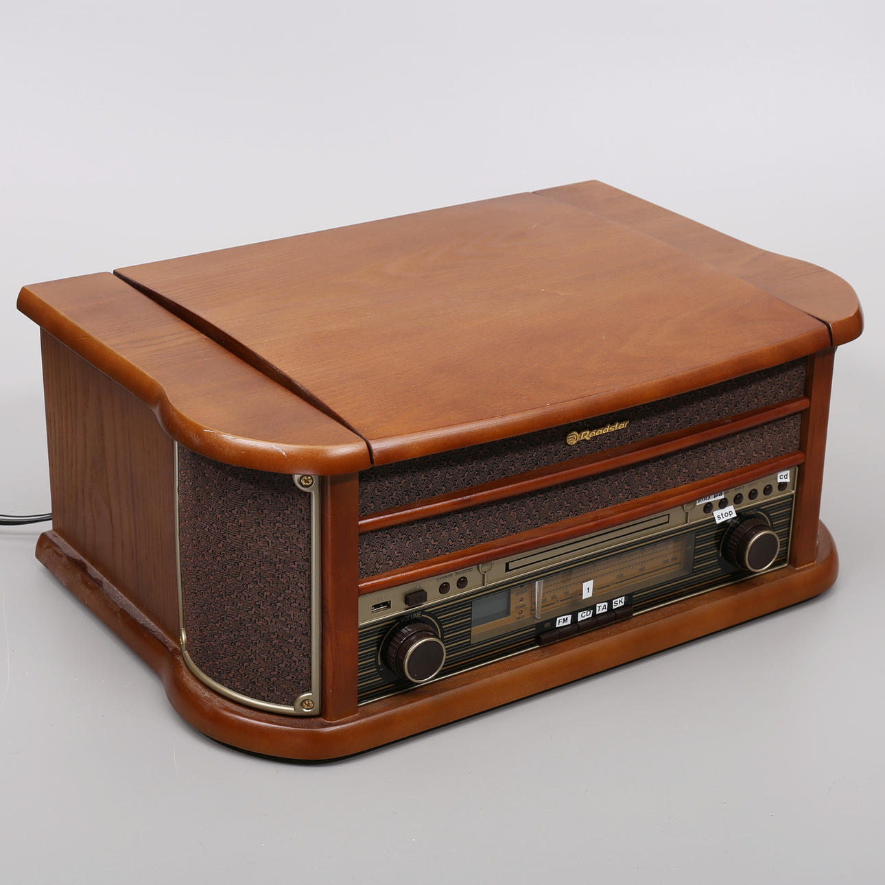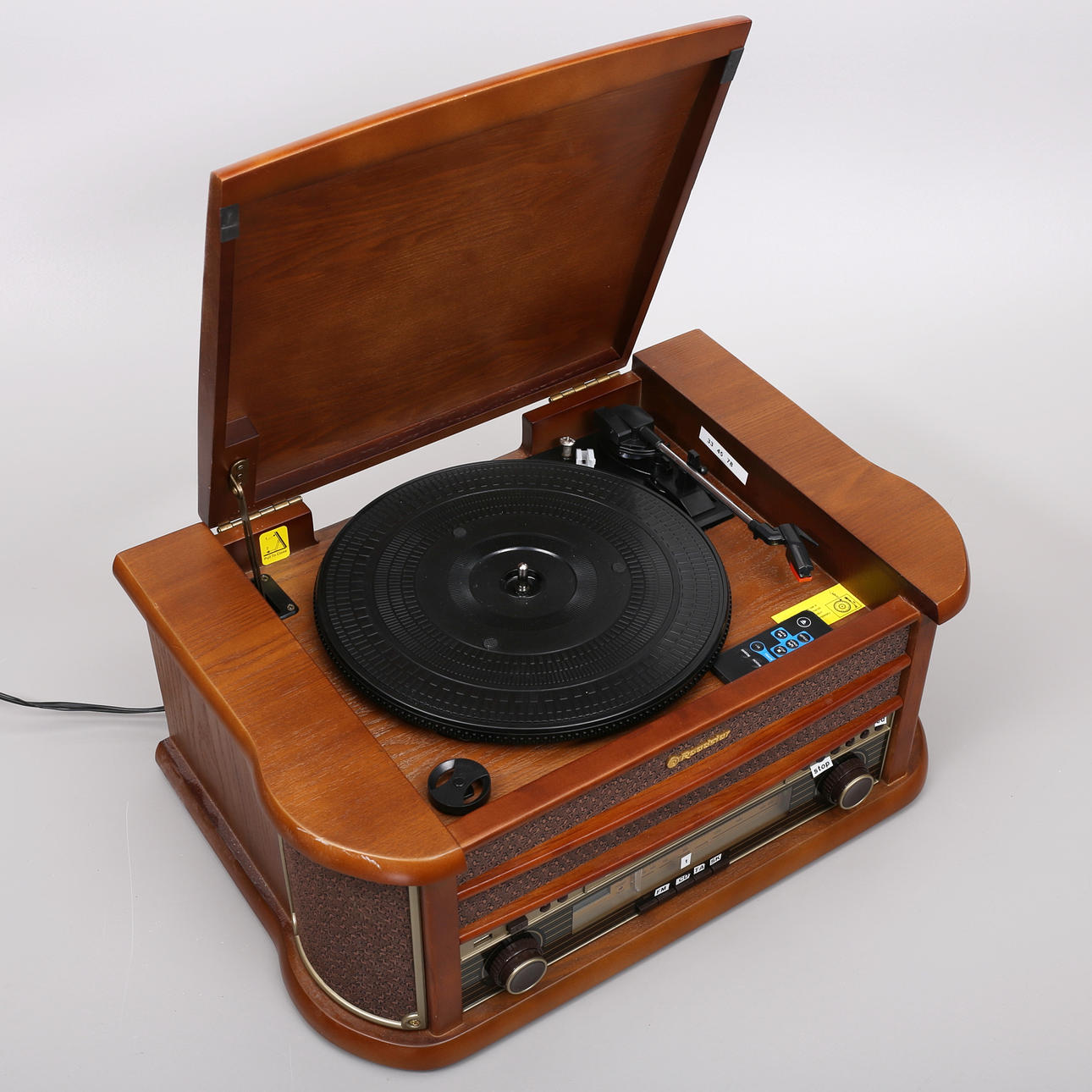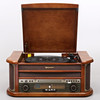 Skivspelare/CD/Kassett/Radio/USB. Inbyggda högtalare. Fjärrkontroll medföljer. Mått ca 51x34x21cm.