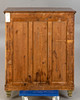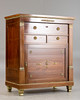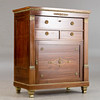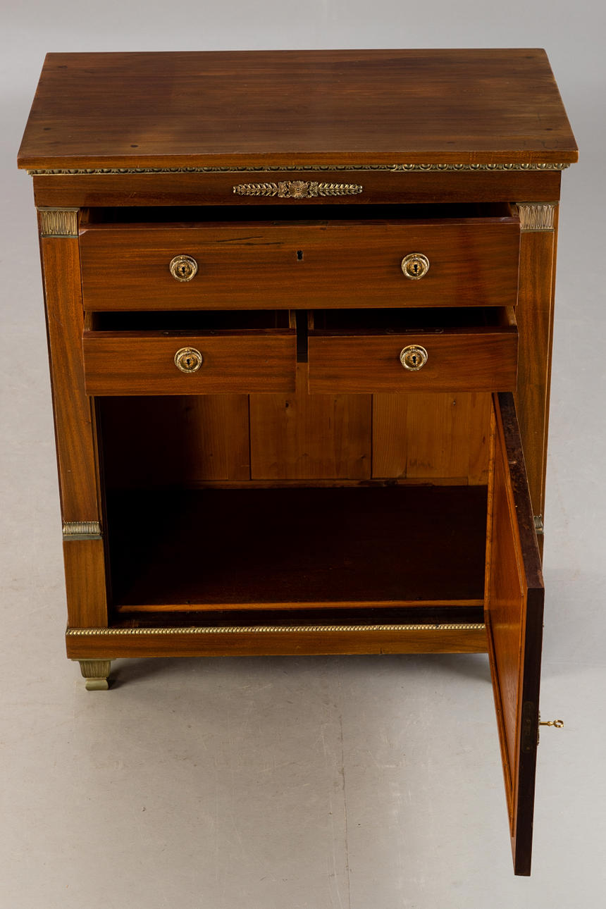 Mahogny/mässing På kvadratfot, den rektangulära kroppen. Den infällda fronten är uppdelad av en dörr under tre lådor i olika storlekar. Pilaster-liknande pilastrar stöder det utskjutande pedimentet. Varierande Empire dekorativa element passivt monterade. HxBxD: ca. 115x95x54cm.