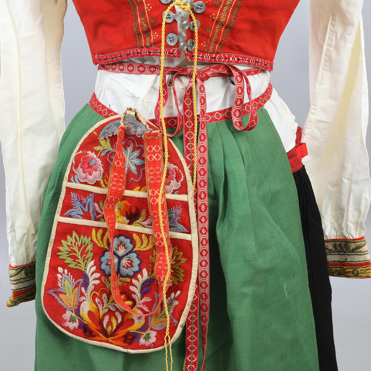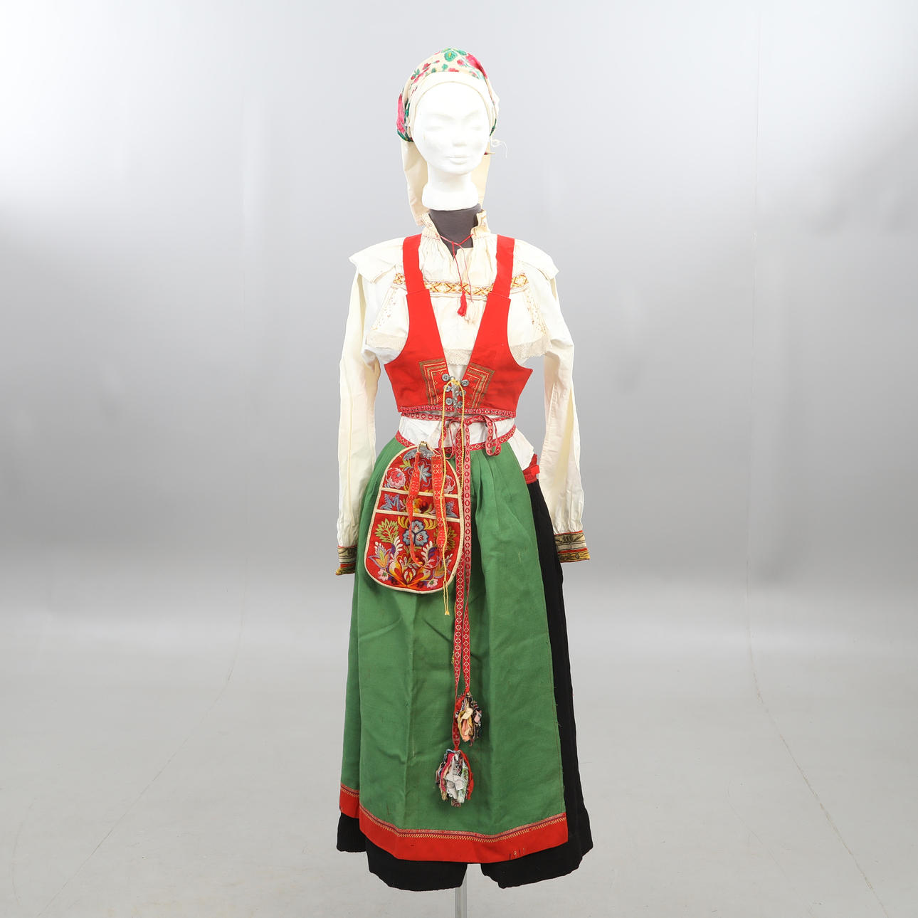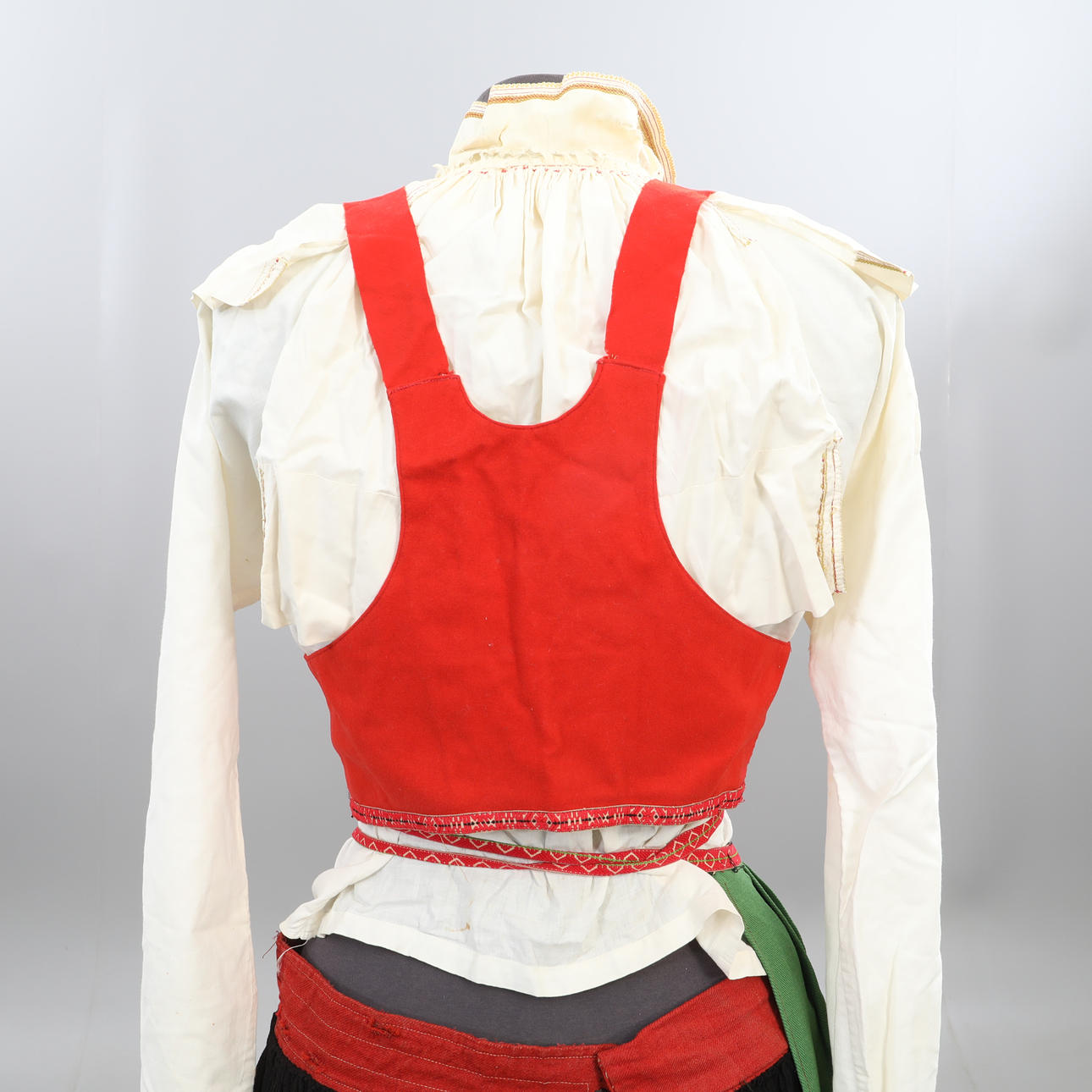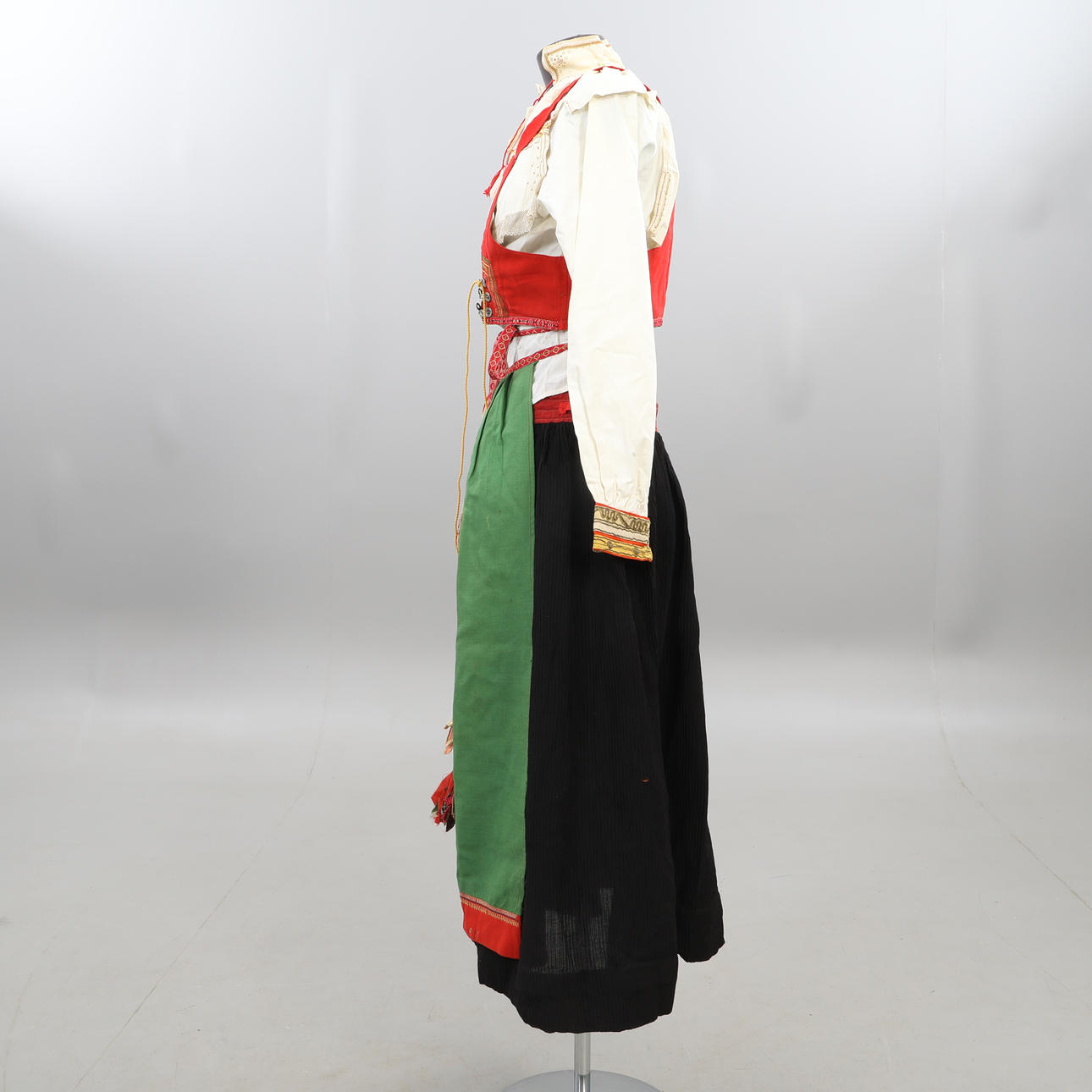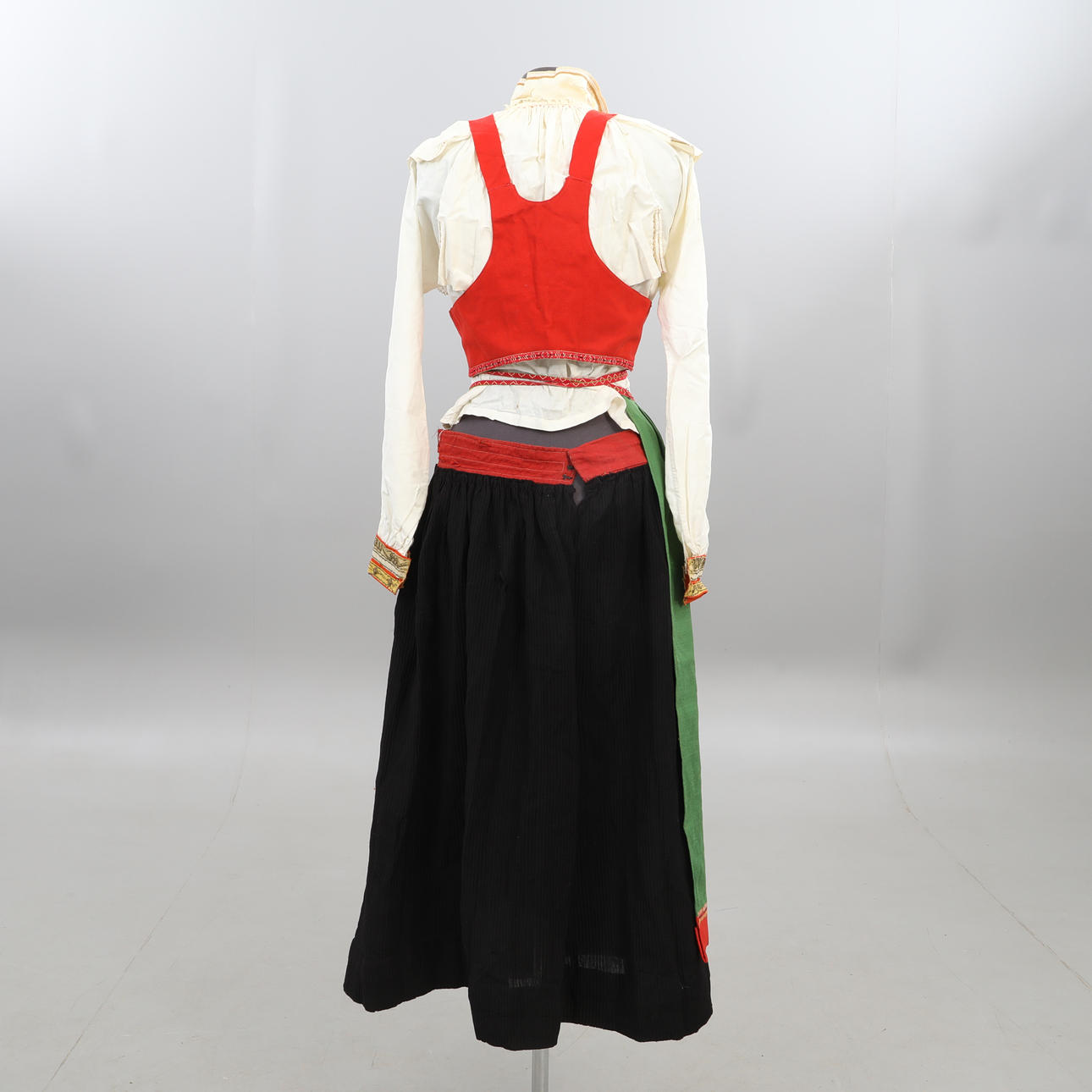 Livkjol, blus, förkläde med band, halskrage, flas, väska, band, väst, scarf