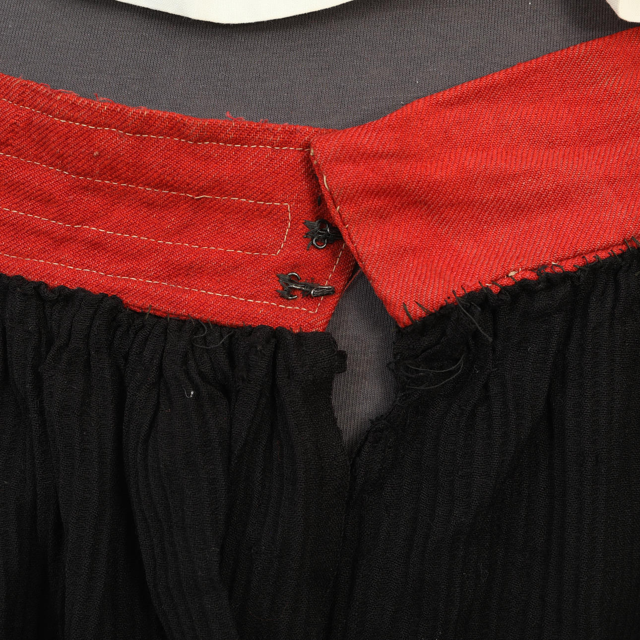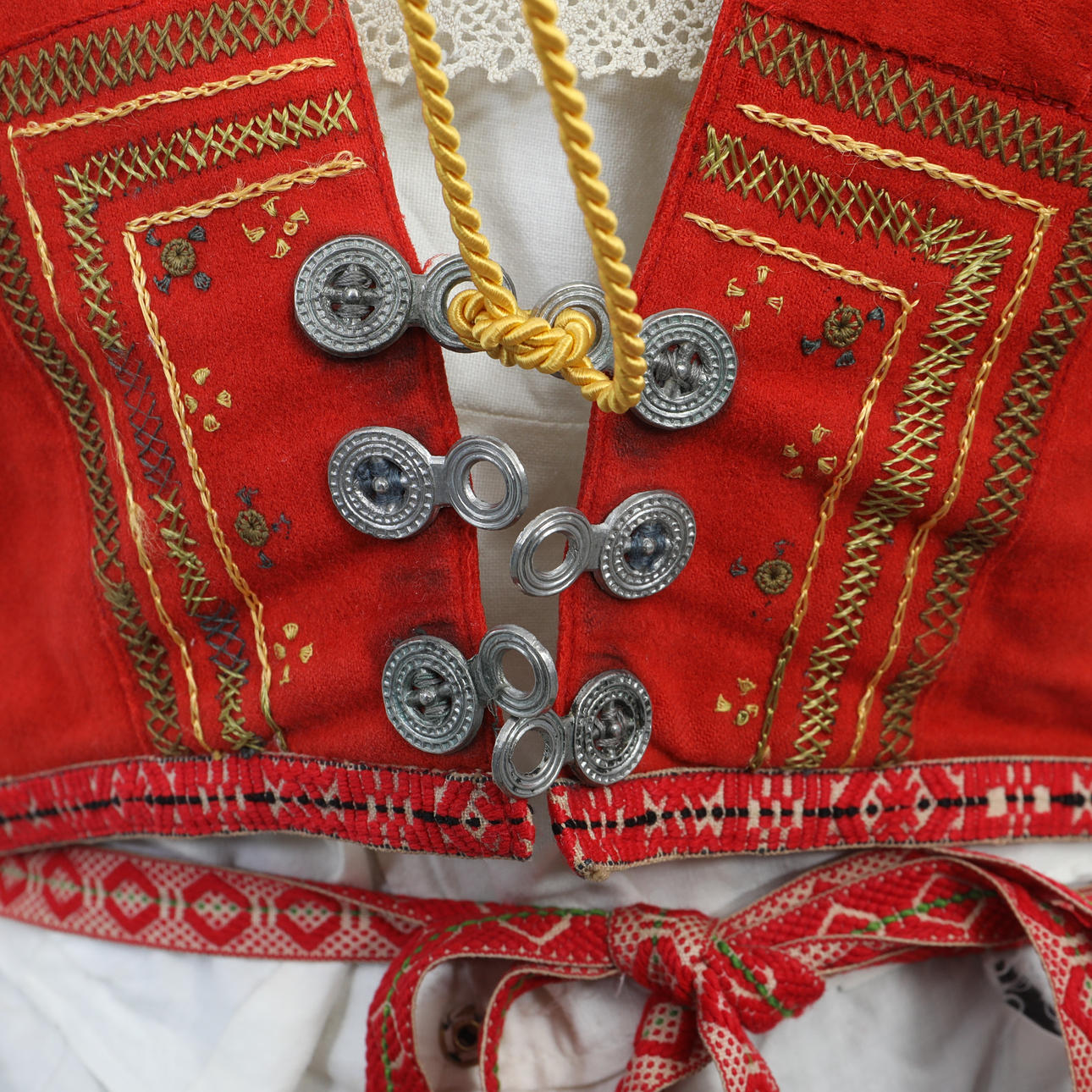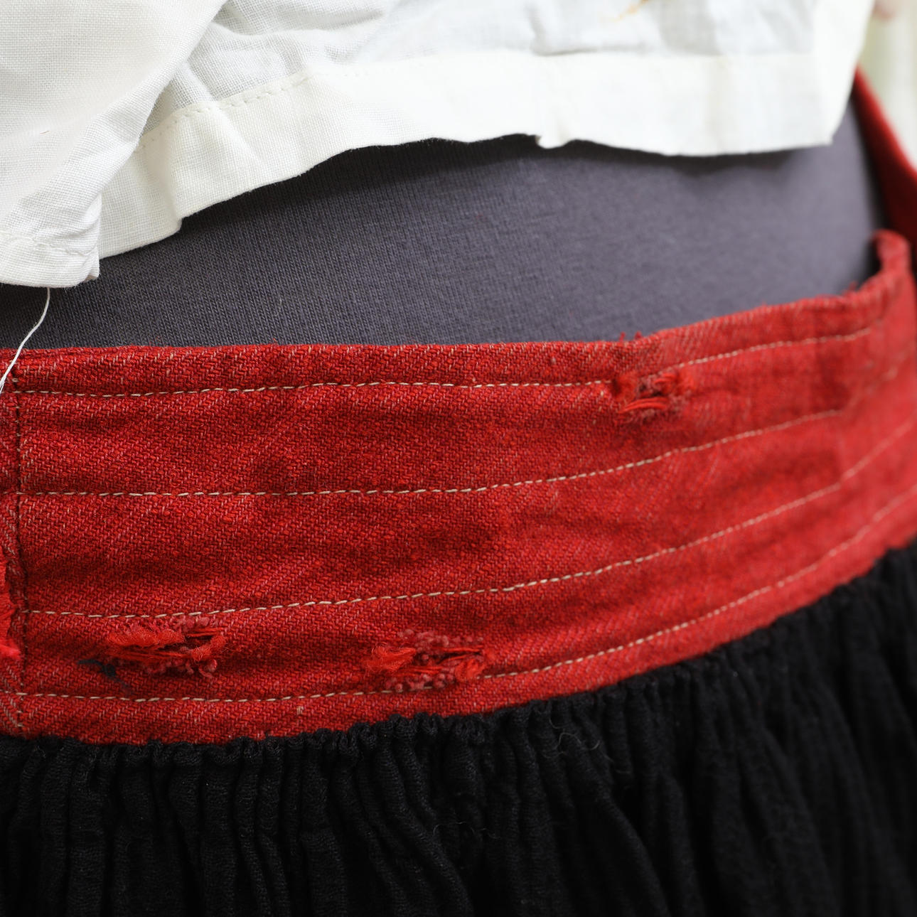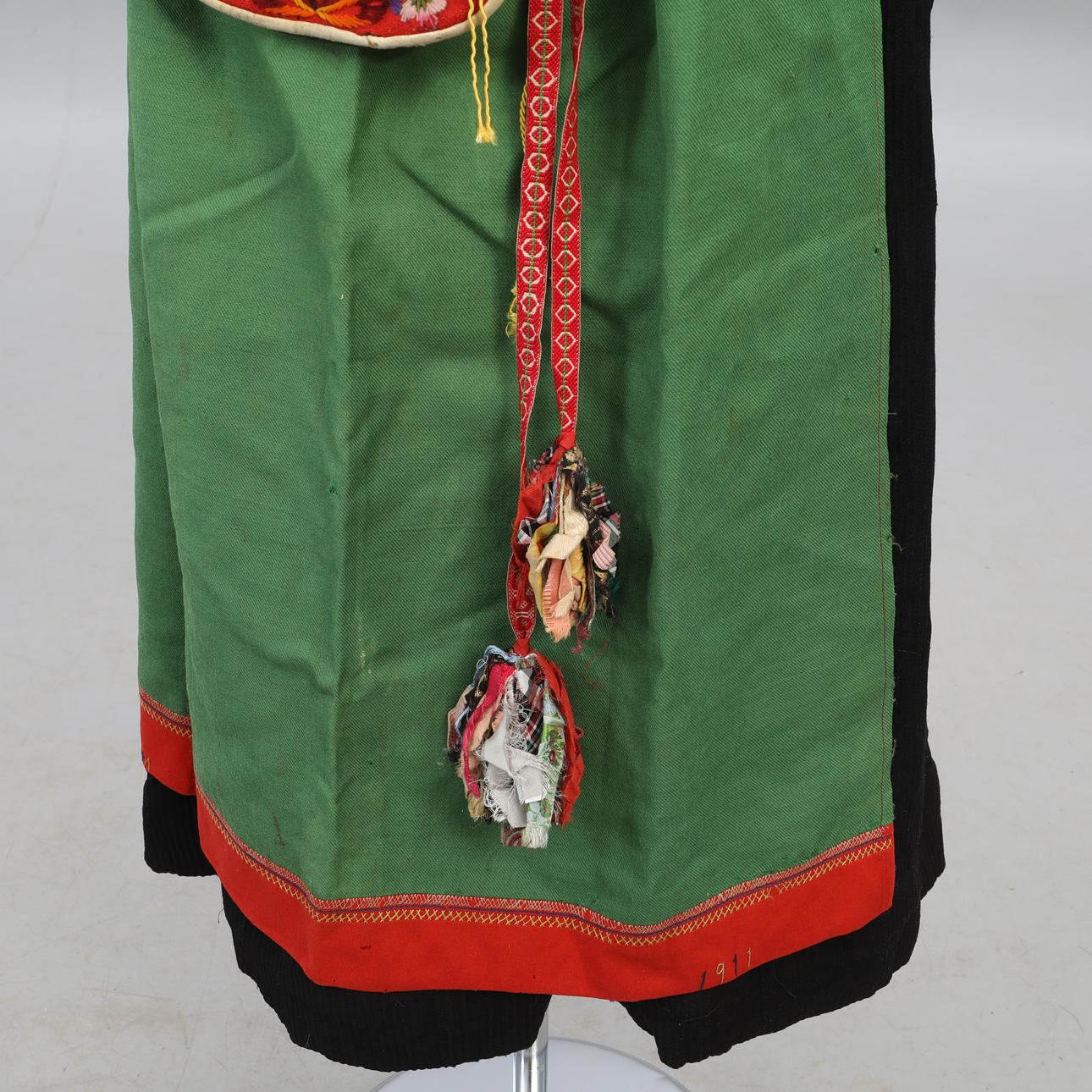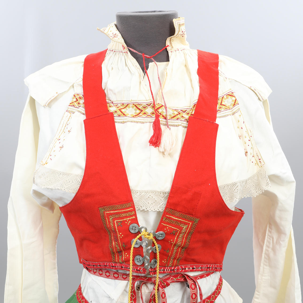 Livkjol, blus, förkläde med band, halskrage, flas, väska, band, väst, scarf