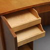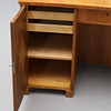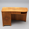 Fanerat med lövträ. Svängd skiva, i sargen låda och hylla, i sidan skåp. Baksidan med hyllplan. Längd 136, djup 69, höjd 76 cm.