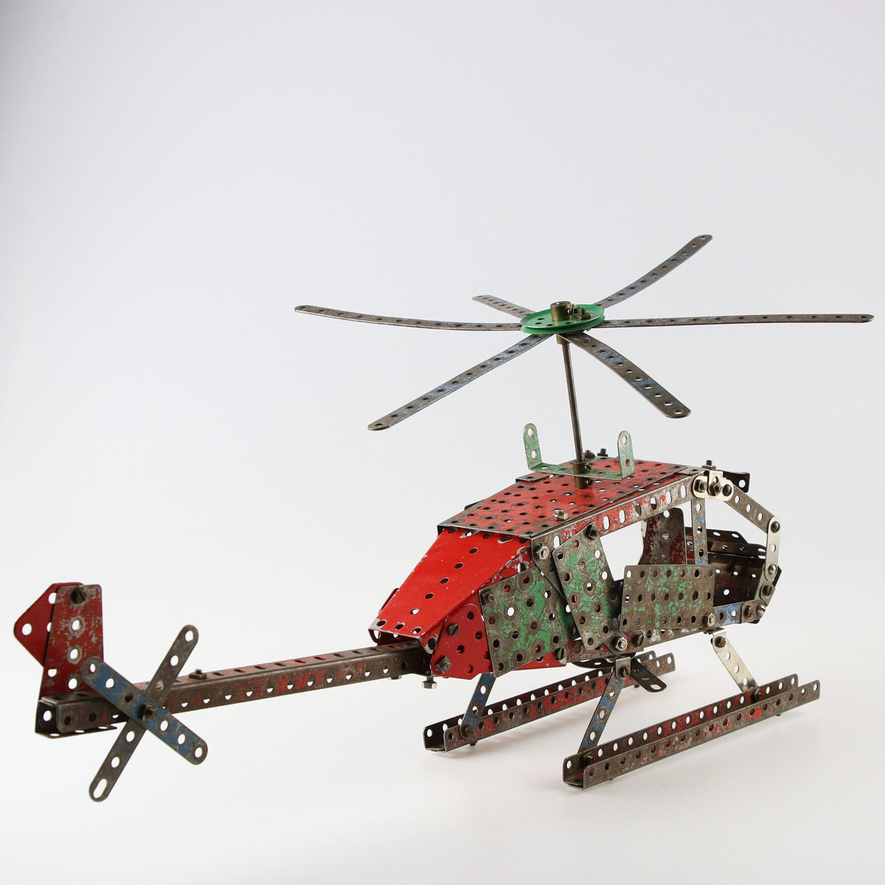 Helikopter med vev undertill för att snurra rotorblad. Ca höjd 26, längd 50, bredd 13, bredd med rotor 35 cm.
