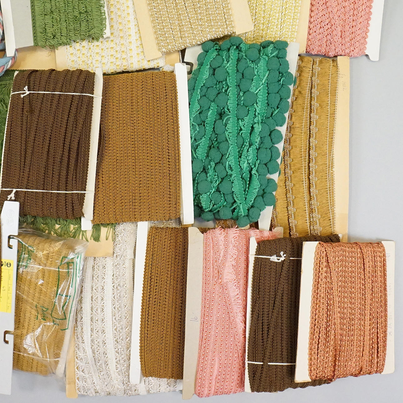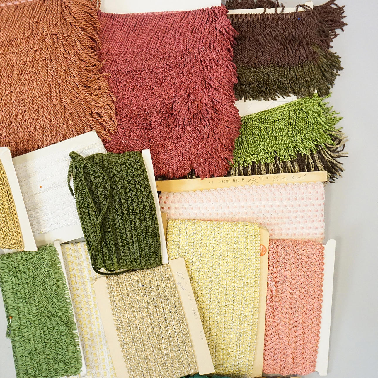 Flera olika färger, material och längder. 9 rullar fransar. 17 rullar band.