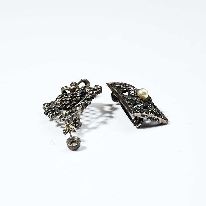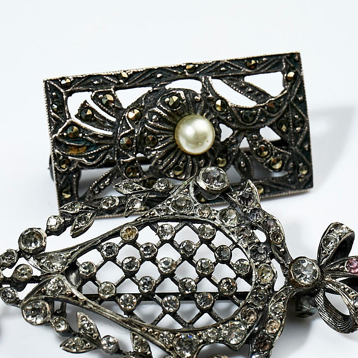 2604608. BROSCHER, 2 st, silver, samt markasiter & glas.