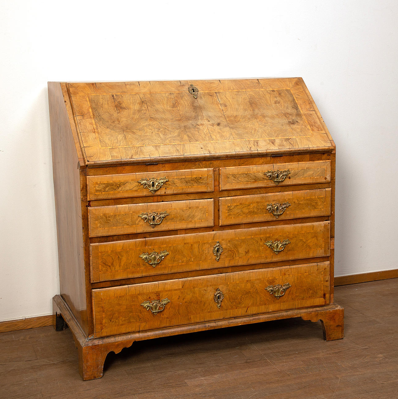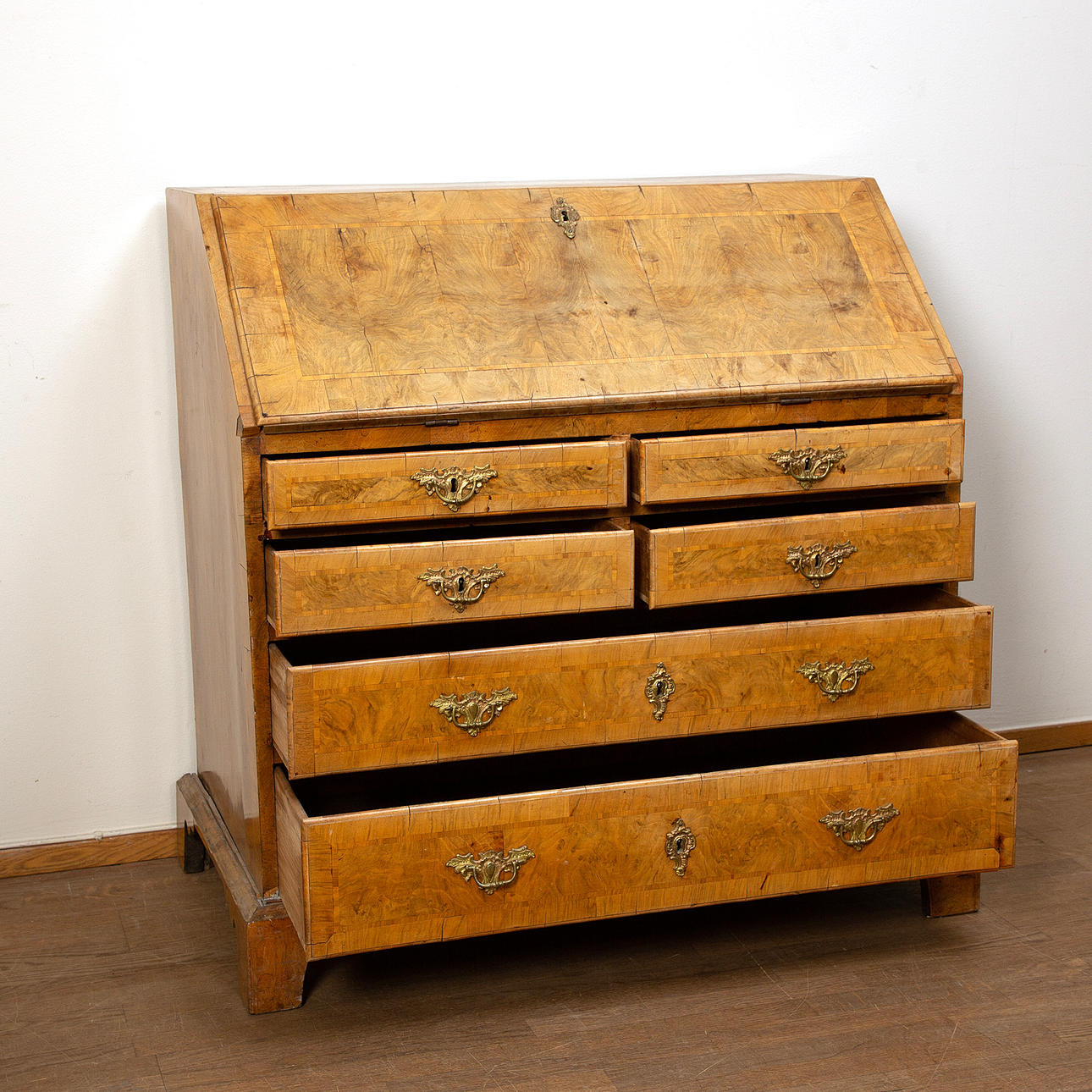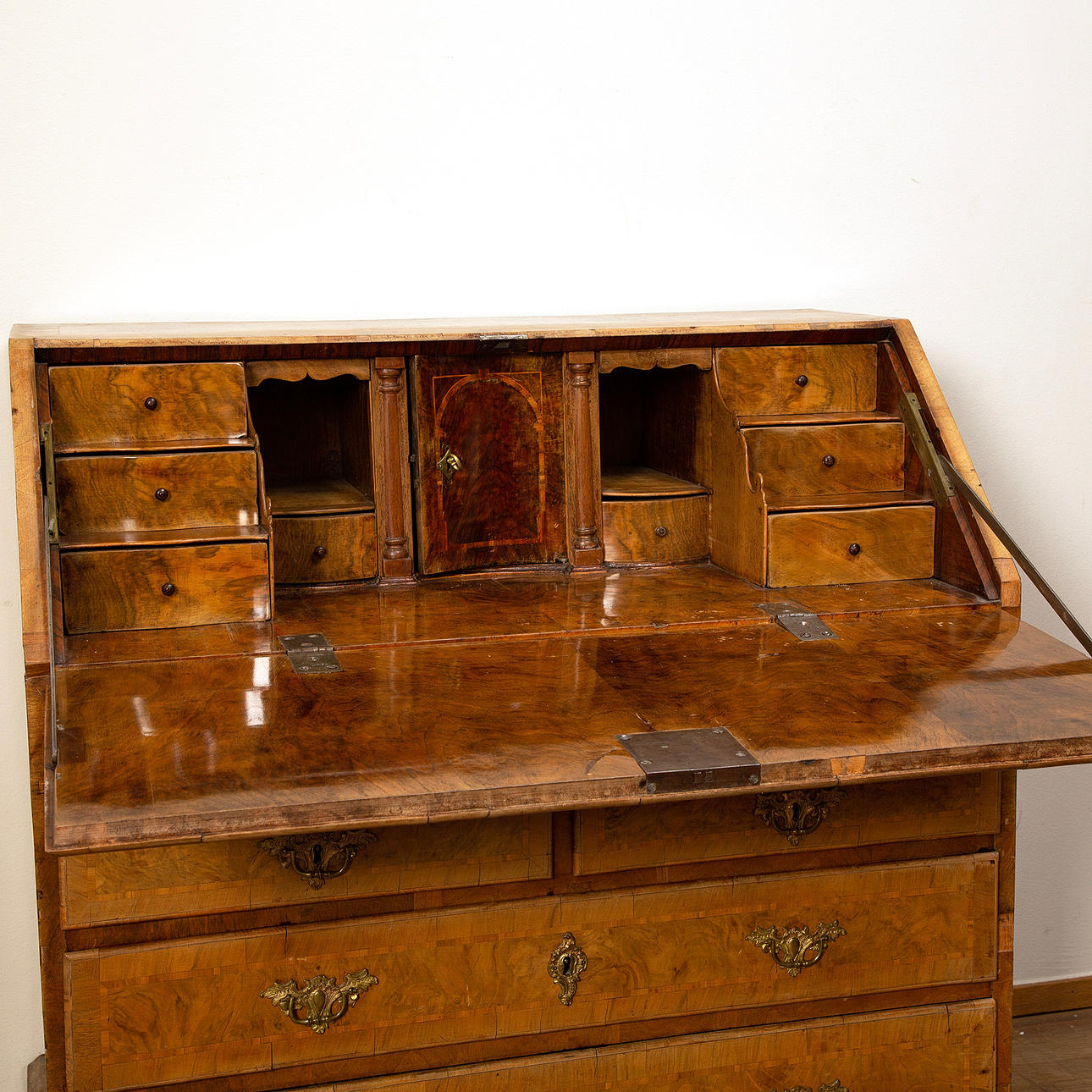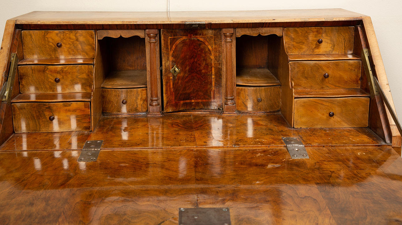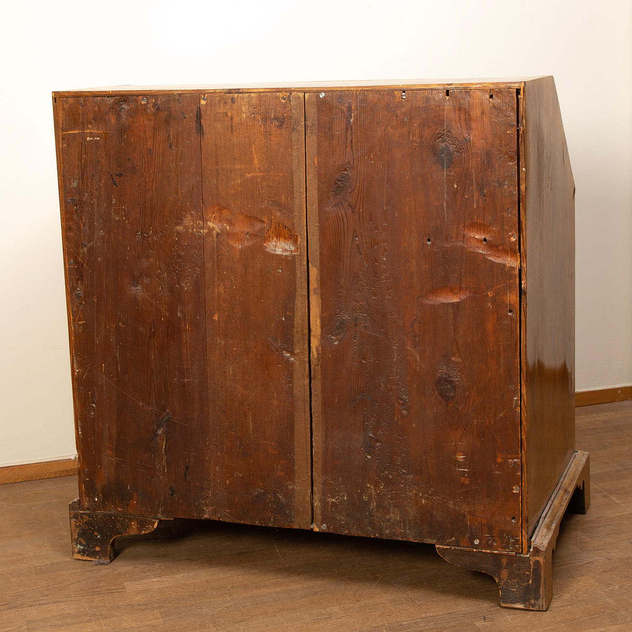 Fanerskador och bortfall. Sprickor. Renoverad och kompletterad. Några lås fungerar ej. Mindre skåp kan ej stängas. Fläckar. En skruv saknas. Blekt.
