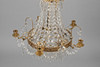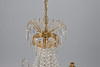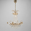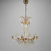 Guldfärgat metallstomme behängd med olikslipade prismor. För 5 ljus och 6 ljuspunkter. Höjd 53, diameter ca 50 cm.
