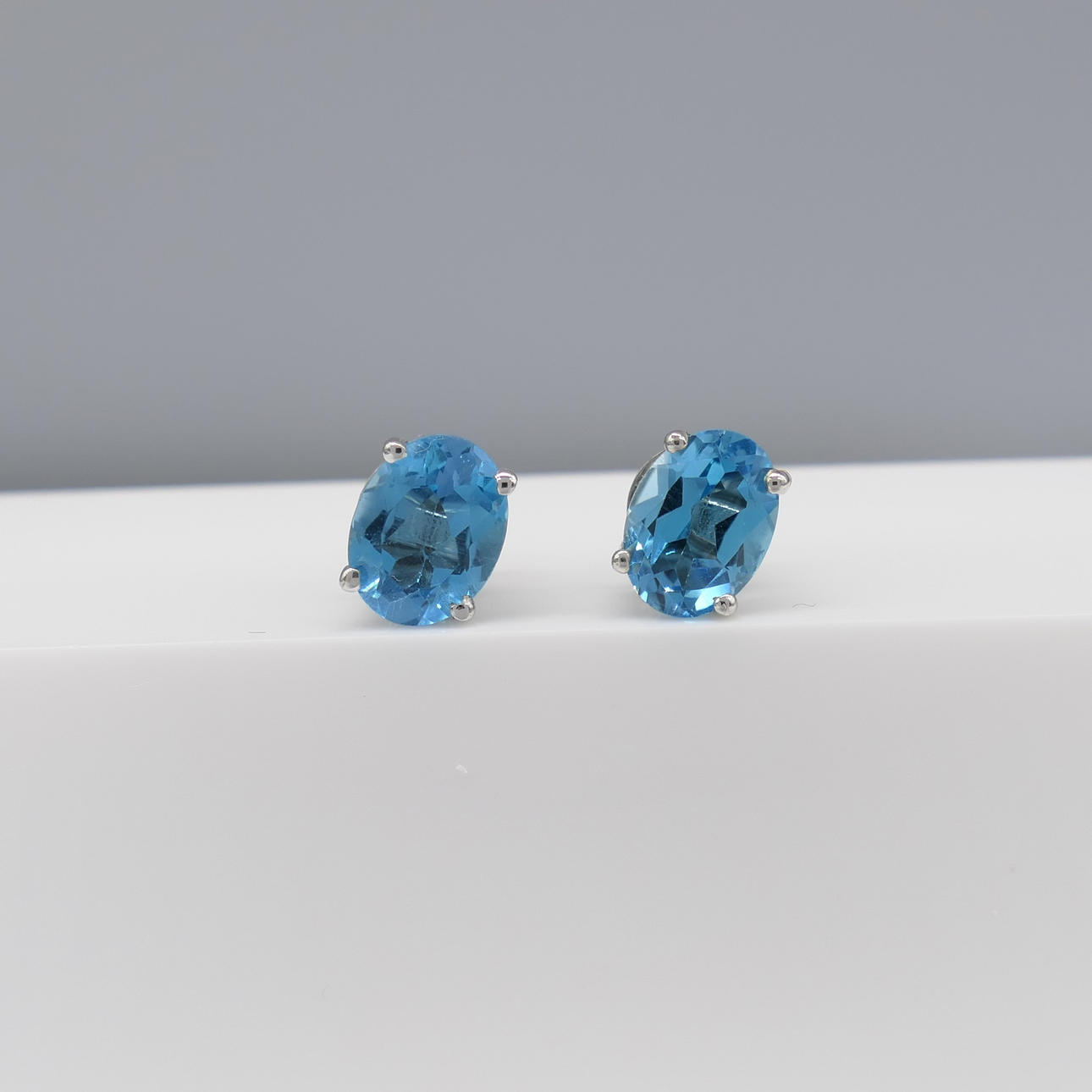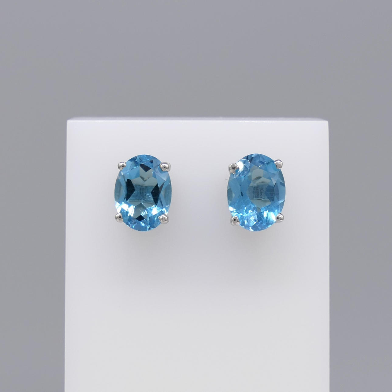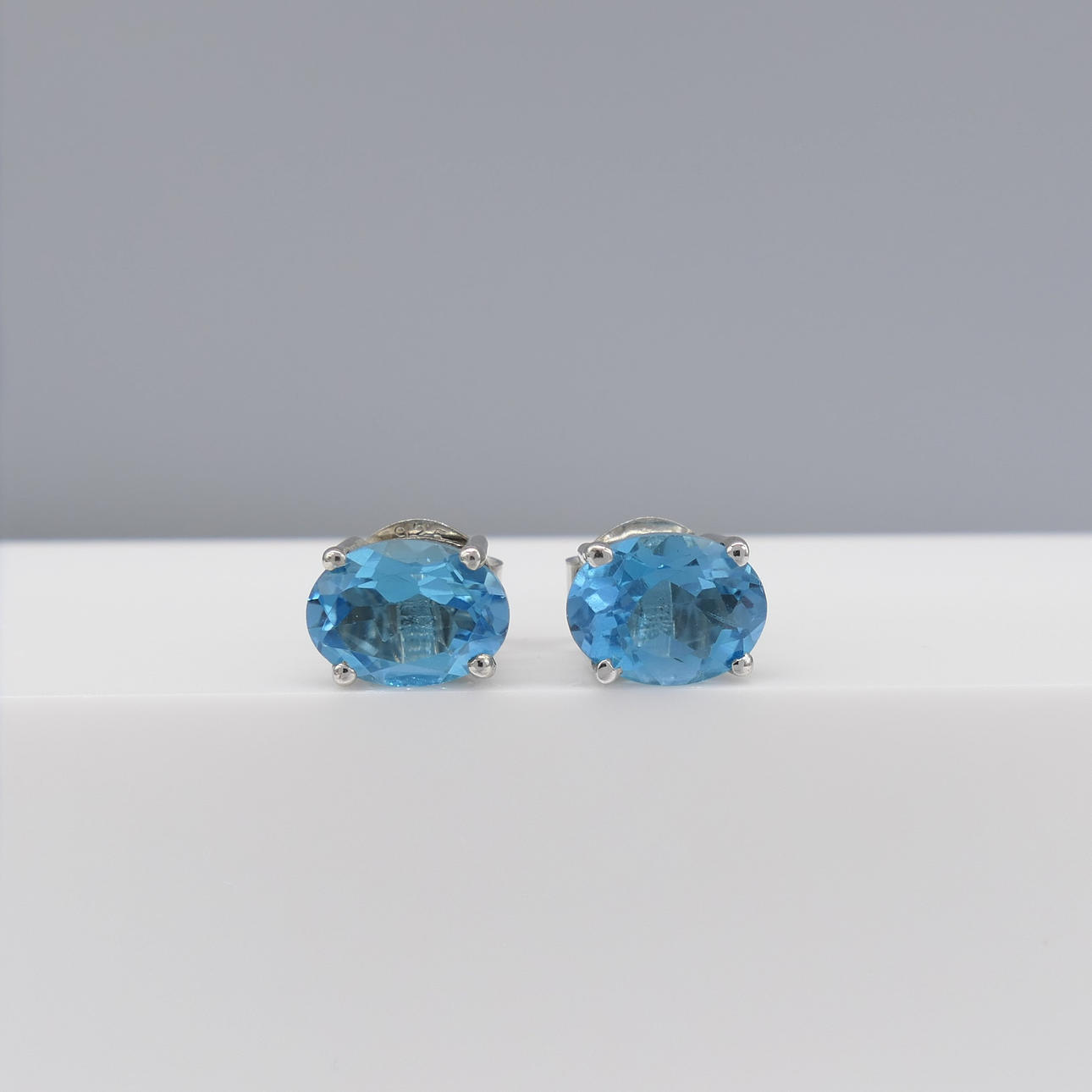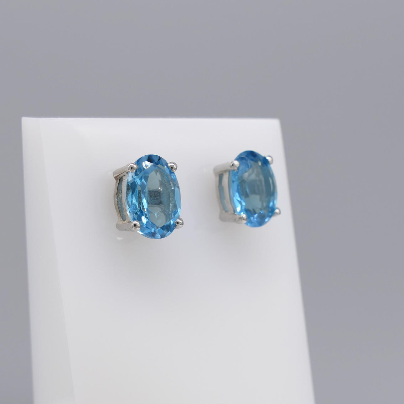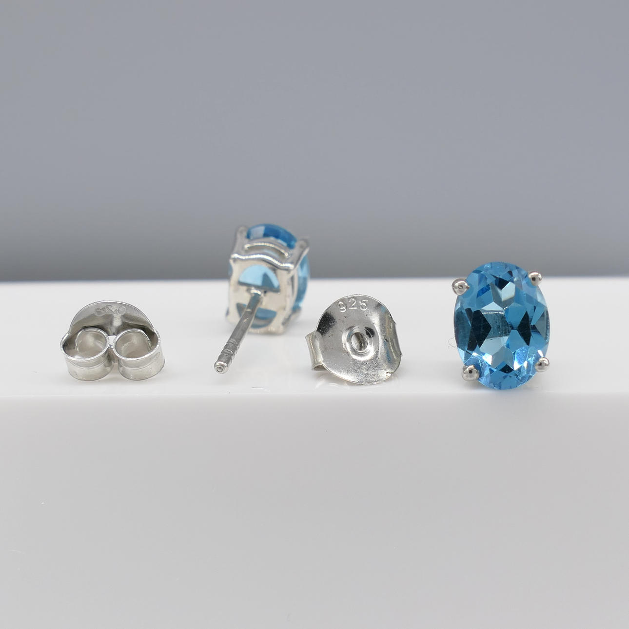 Varje tapp i detta par är klouppsättning med en oval skuren naturlig blå topas ädelsten som mäter 8 x 6 mm.